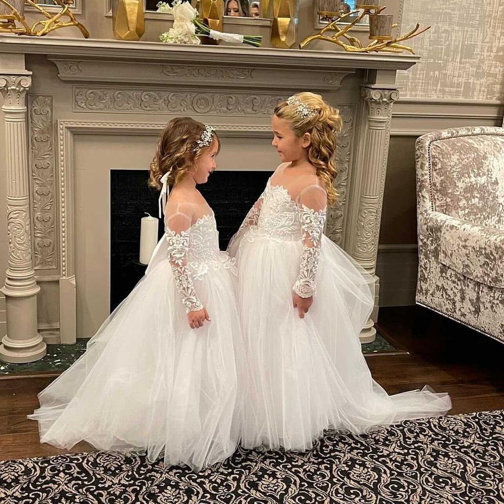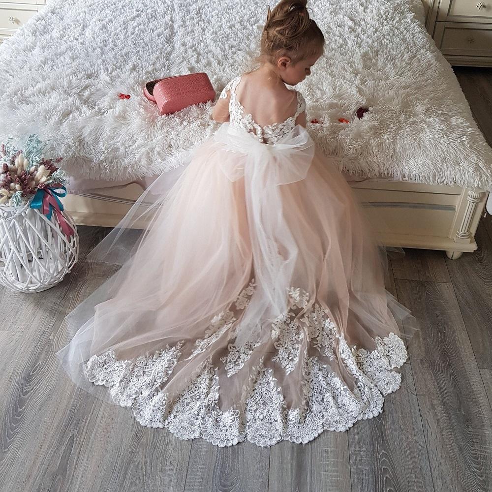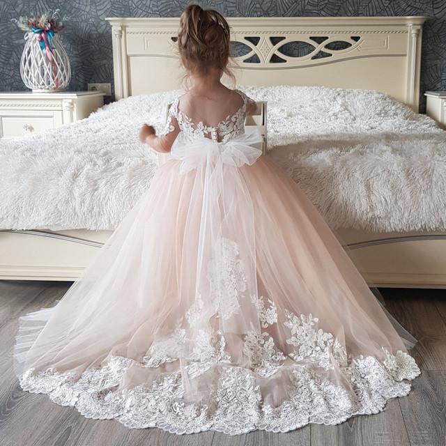 Милые платья с цветочным узором для девочек на свадьбу, длинные маленькие пышные платья с большим бантом и аппликацией, белые тюлевые платья для девочек, платья для первого причастия