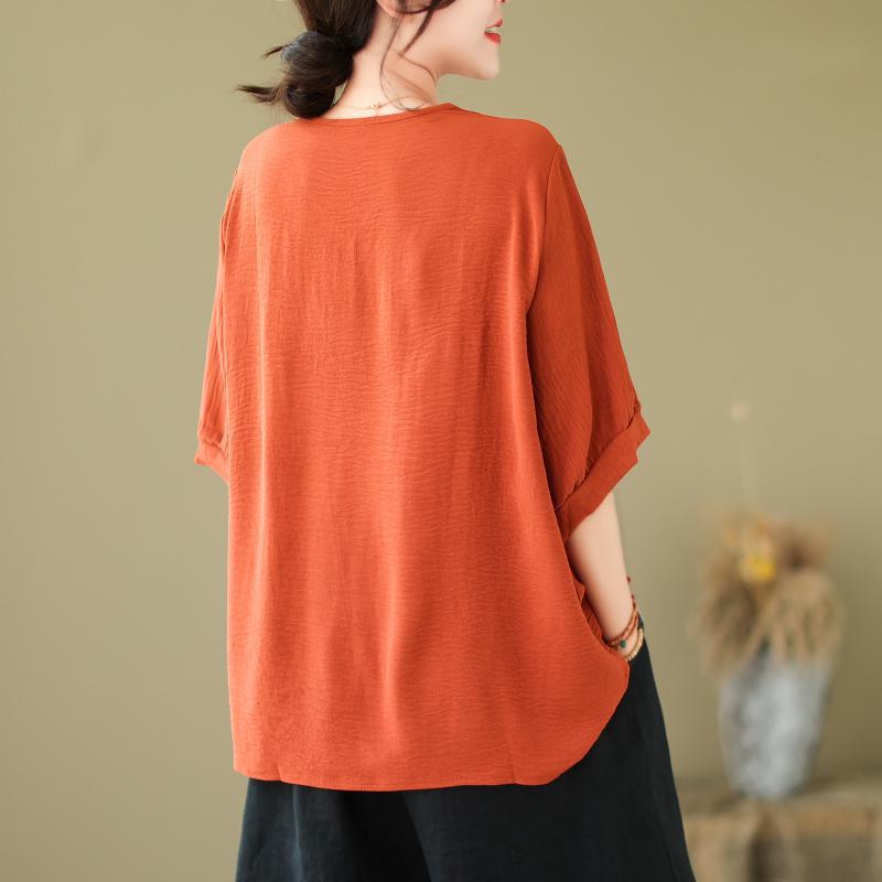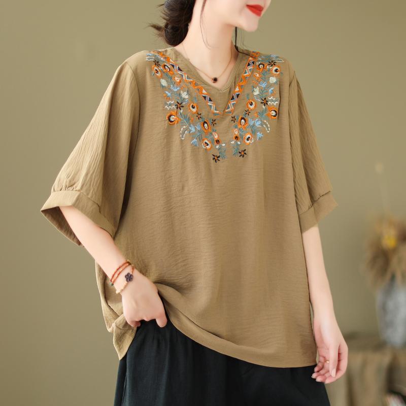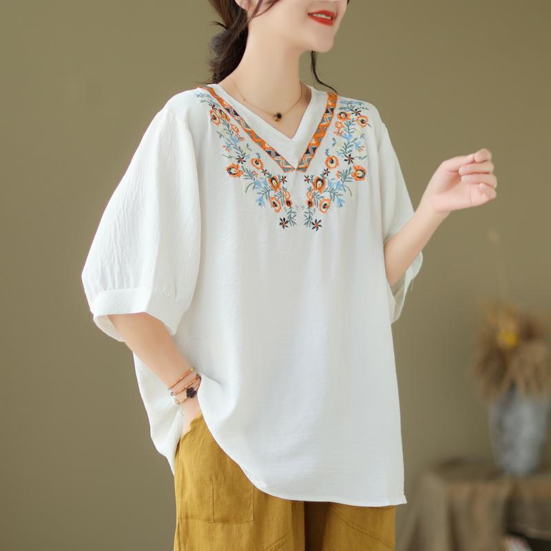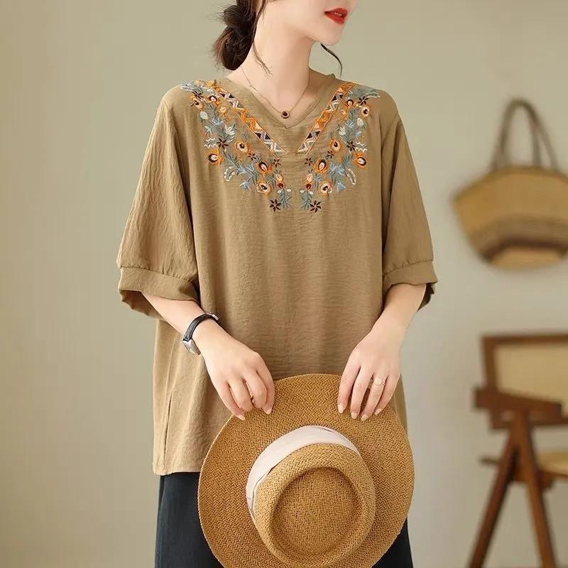 Хлопковая блузка с вышивкой, v-образный вырез, короткий рукав, женский летний корейский свободный топ