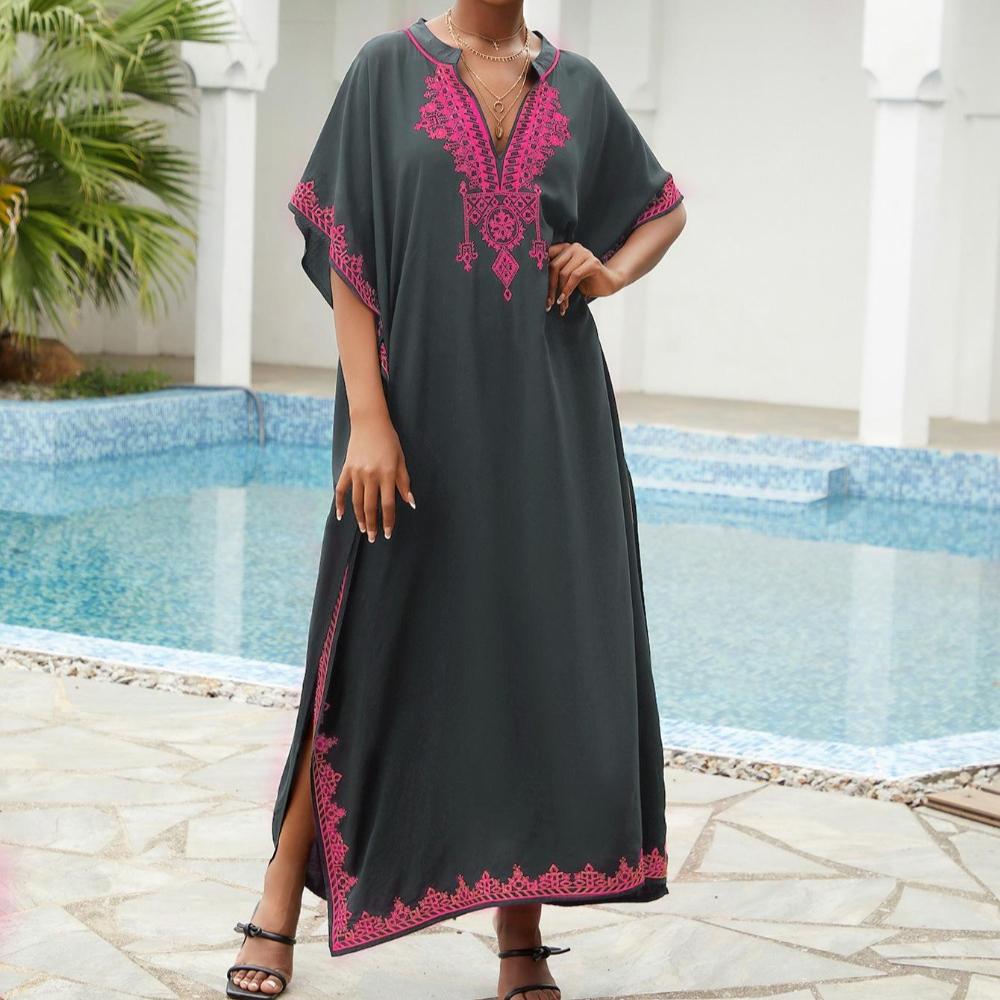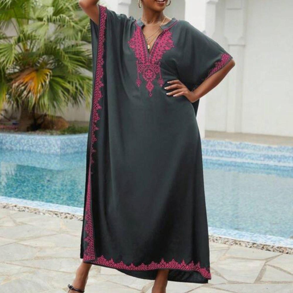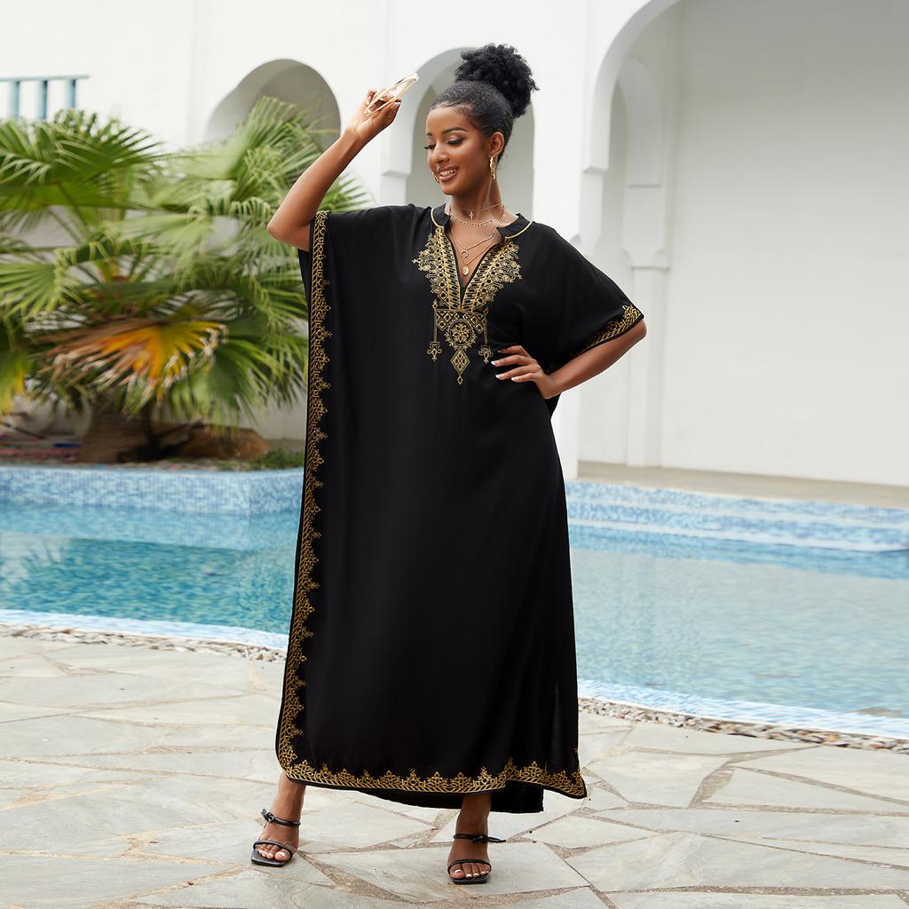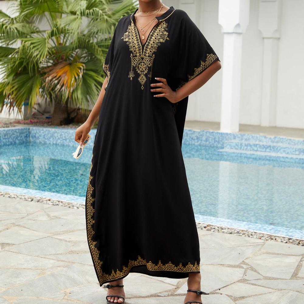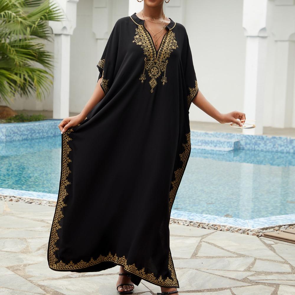 Пляжные накидки, черные кафтаны с вышитыми цветами и воротником-стойкой для женщин, праздничные купальные костюмы больших размеров