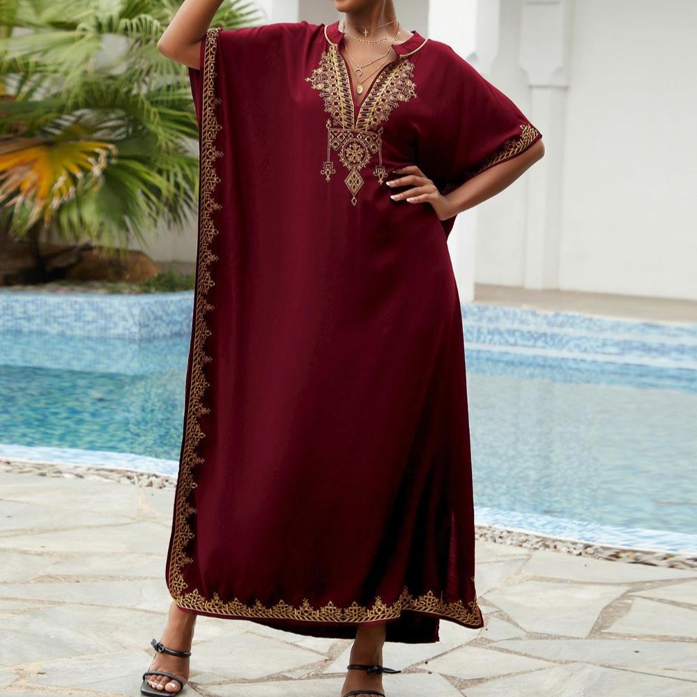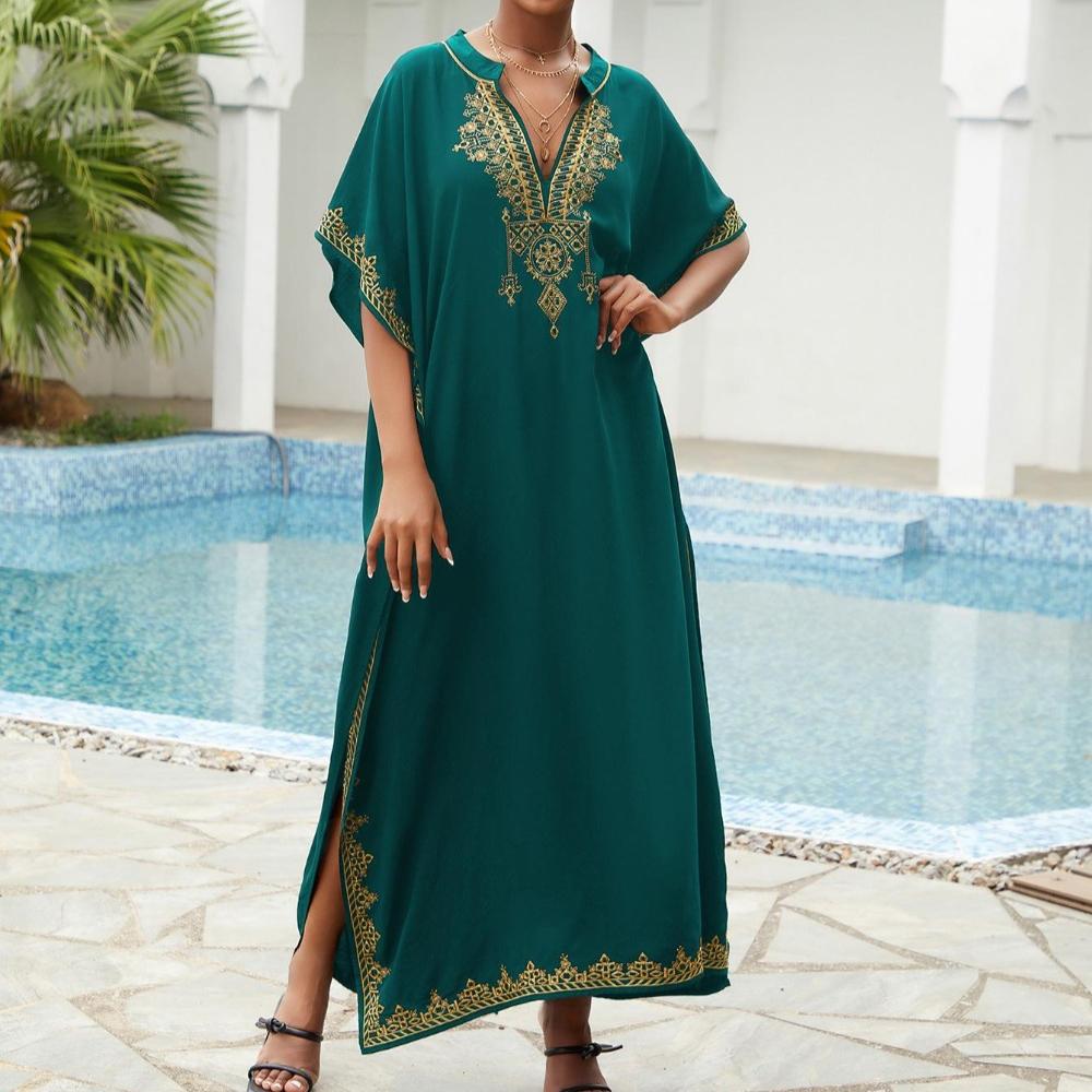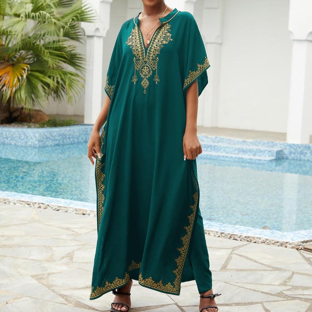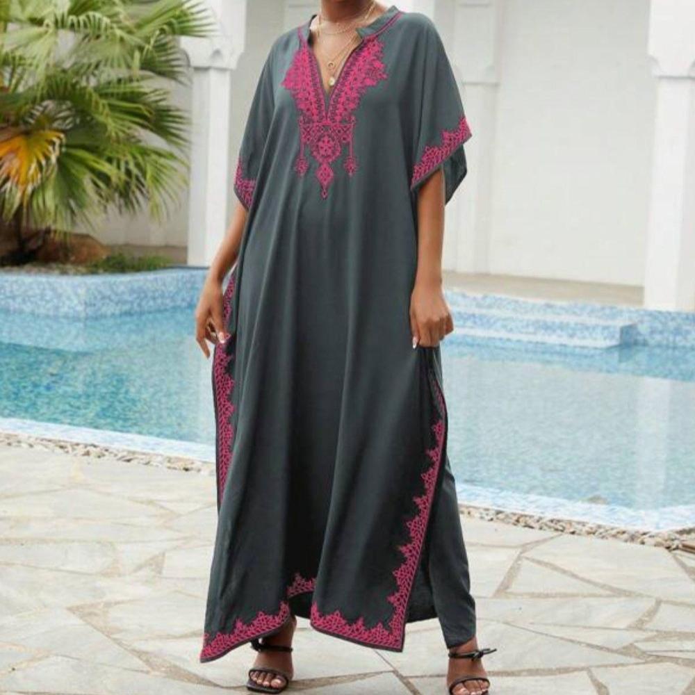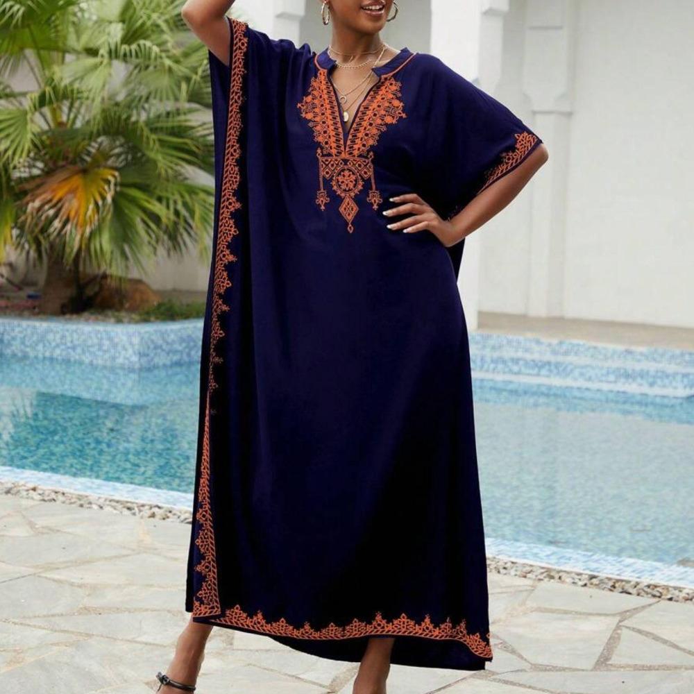 Пляжные накидки, черные кафтаны с вышитыми цветами и воротником-стойкой для женщин, праздничные купальные костюмы больших размеров