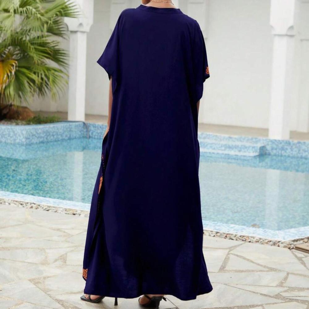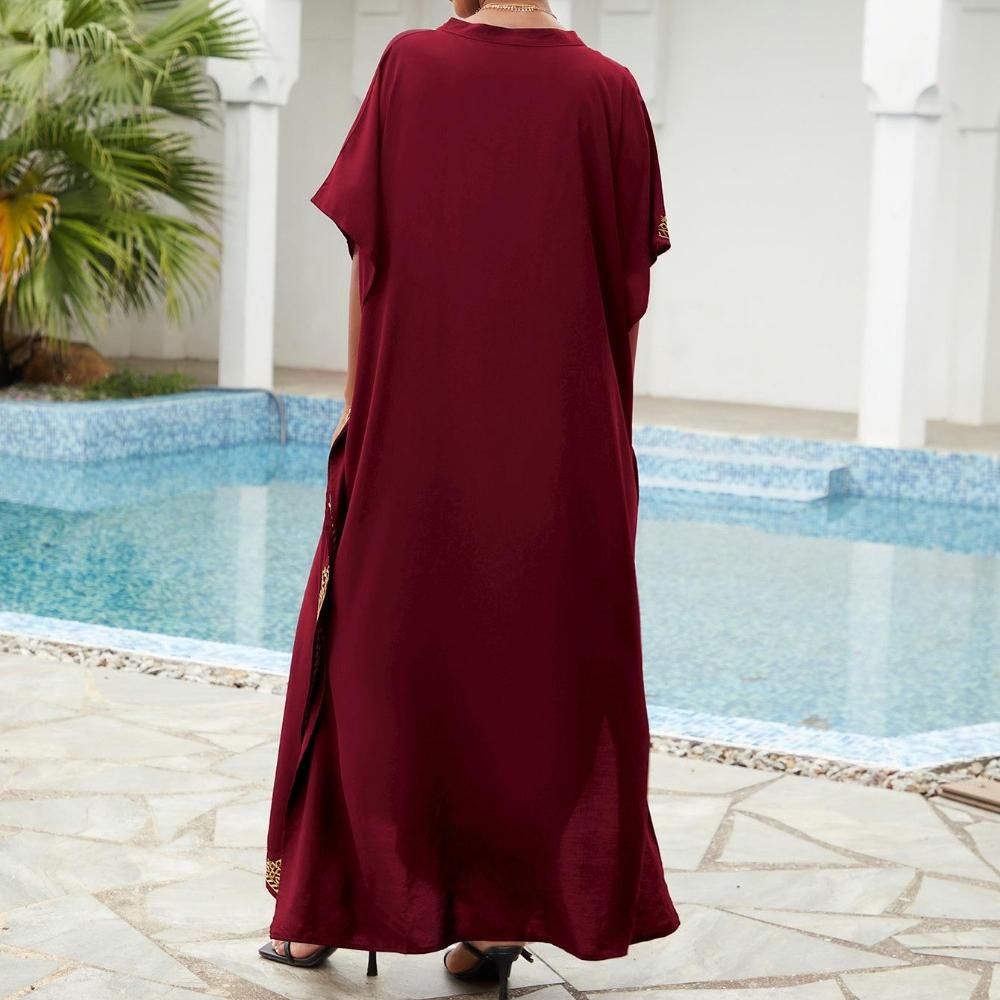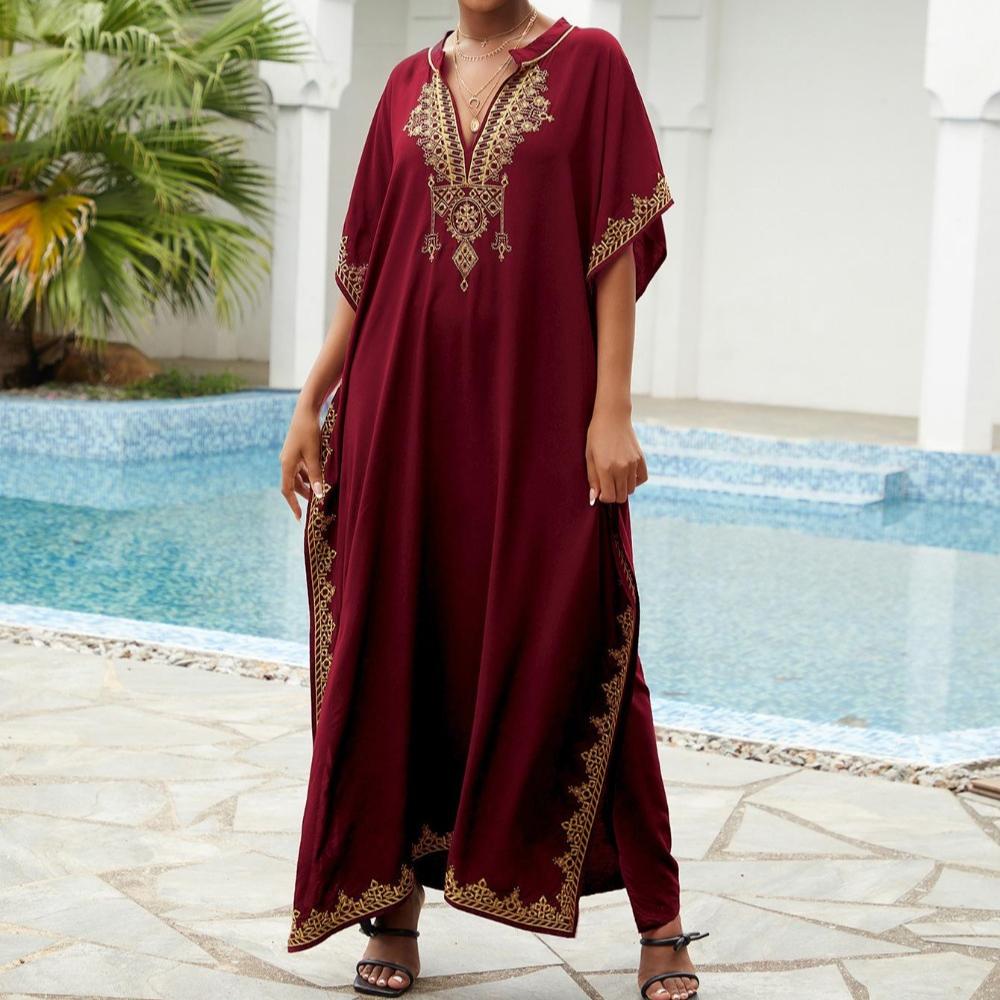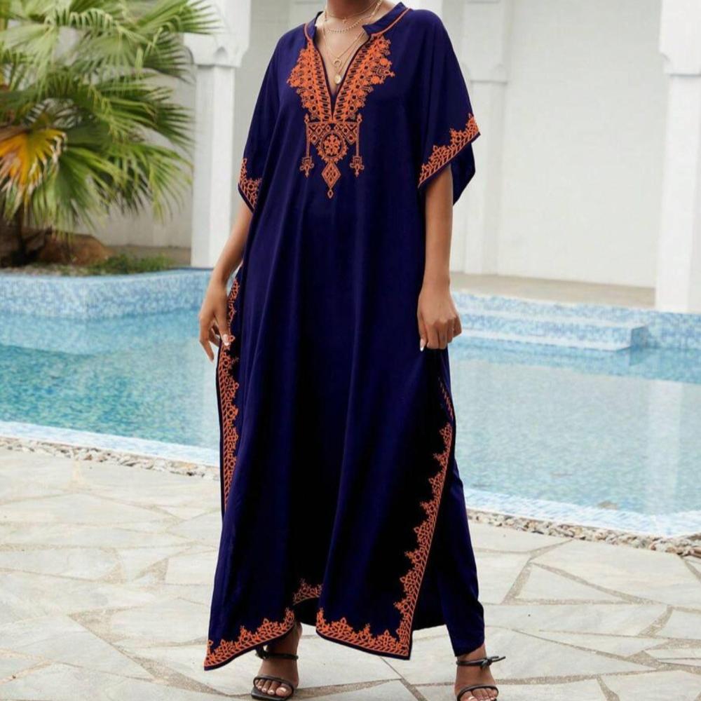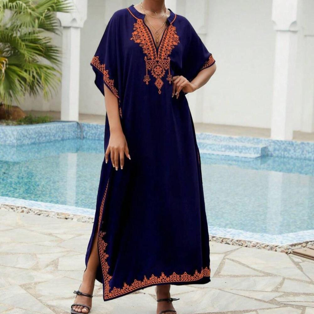 Пляжные накидки, черные кафтаны с вышитыми цветами и воротником-стойкой для женщин, праздничные купальные костюмы больших размеров