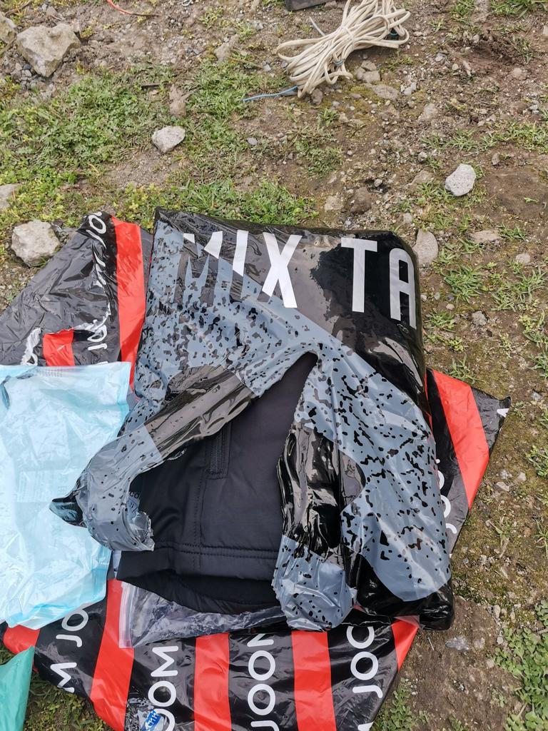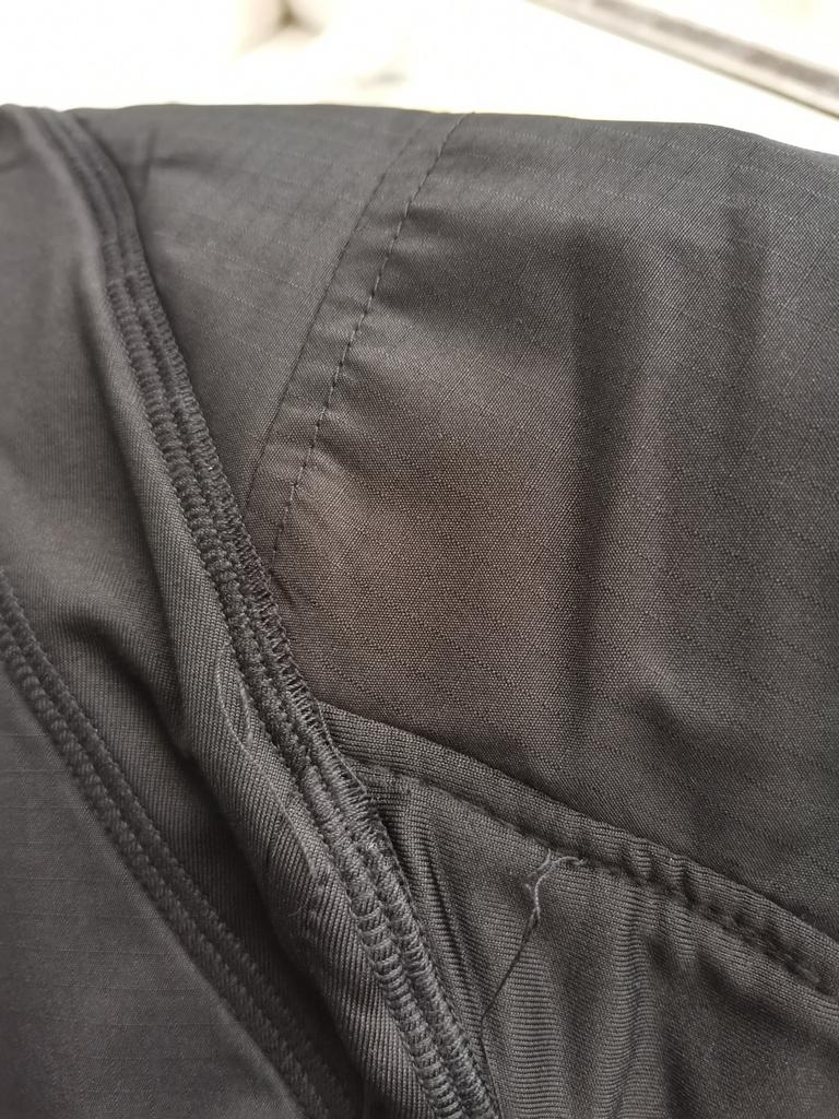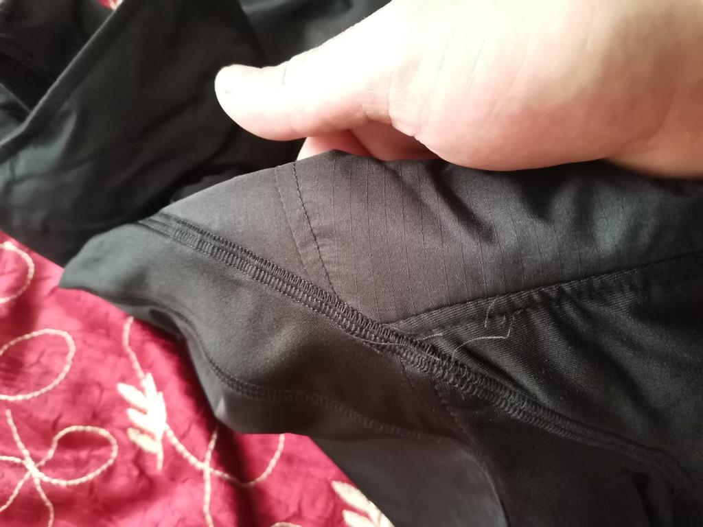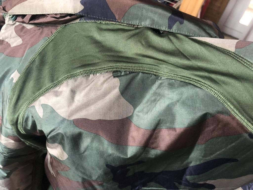 The jacket is not waterproof, see photo - there is a strip of fabric on the back that gets wet immediately.