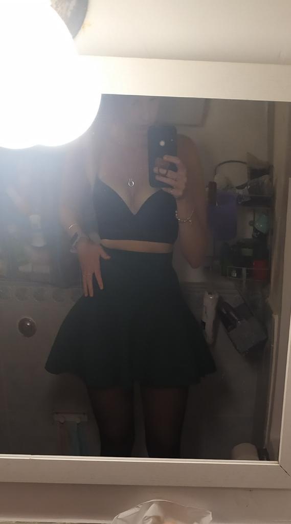 Looks just like in the picture. It came super fast not even 2 weeks passed. Skirt is short so cant bend in it. Soft and comfy so recommend only a bigger size.