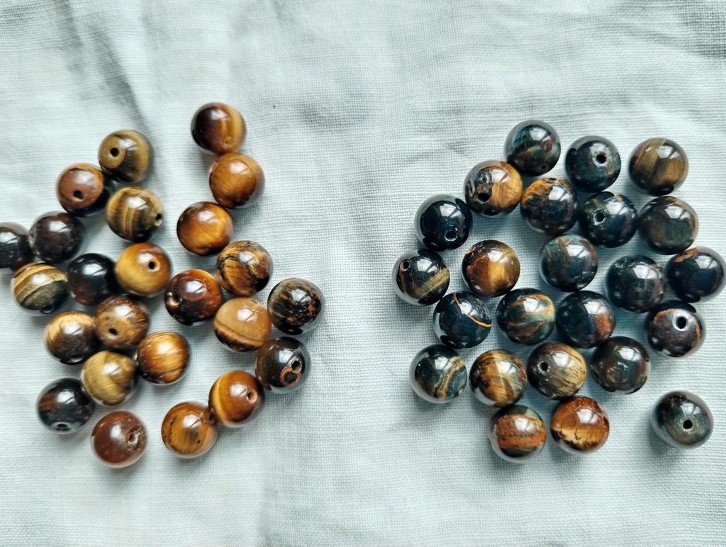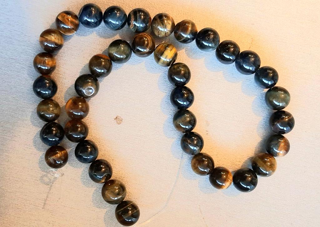 Красивый натуральный камень. В 24 бусинах есть сине-серые волокна, и в 24 преобладают коричневато-золотые тона. А все это соколино-тигровый глаз.