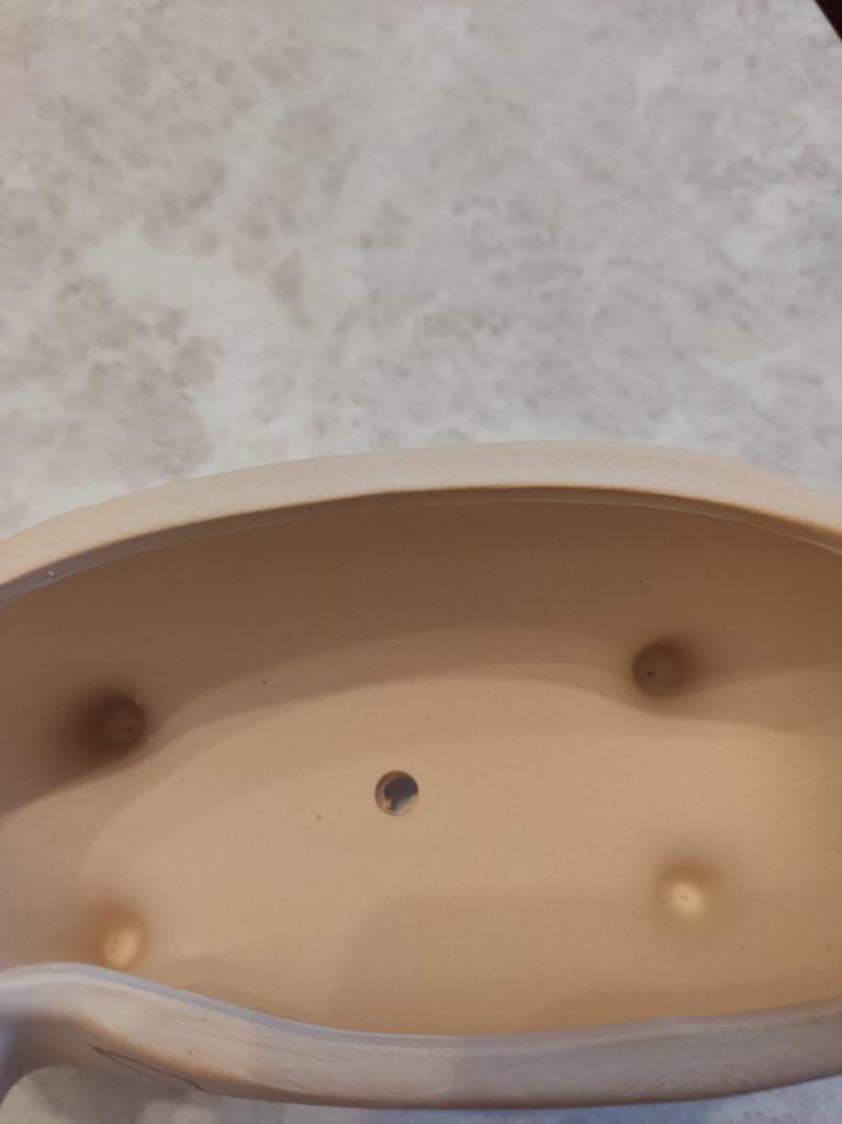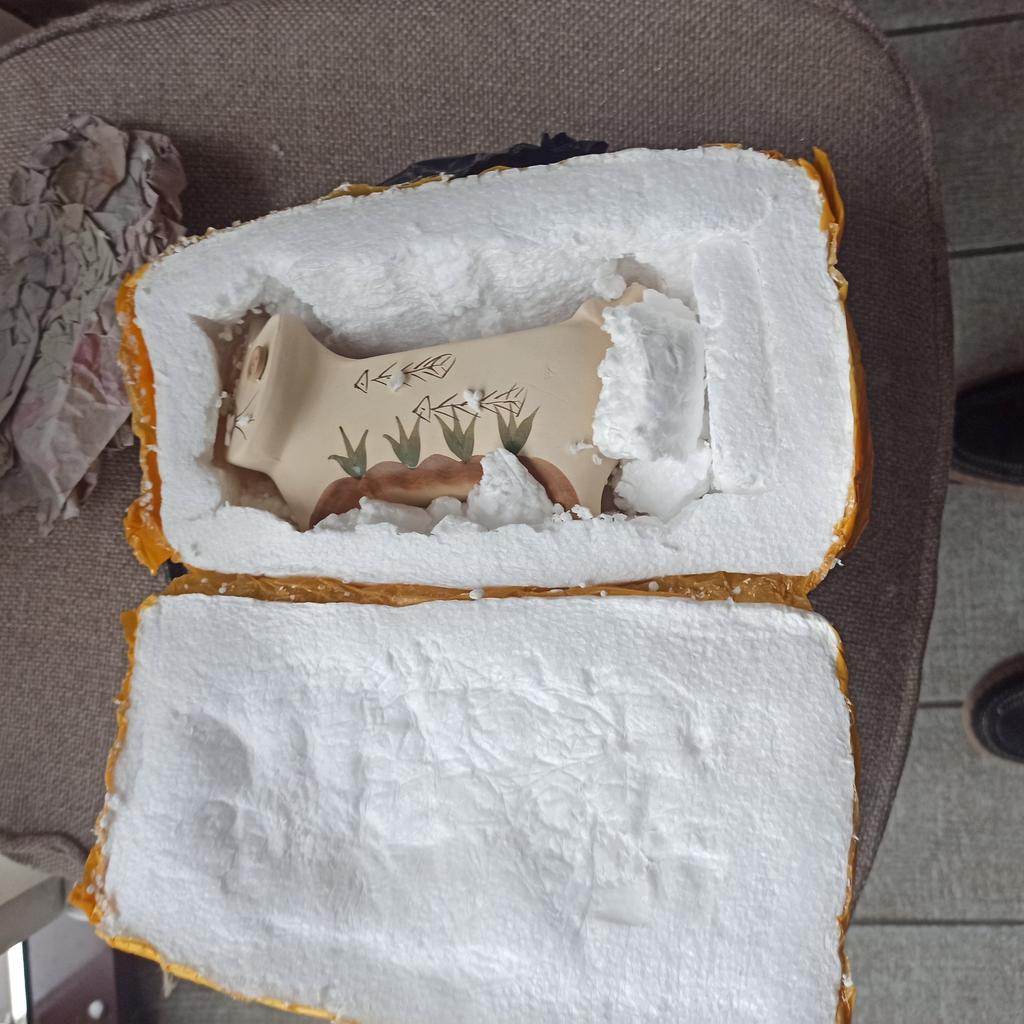 Very reliable packaging: the pot in a box made of thick foam, wrapped with tape on top. Arrived without any damage. Ceramics, no glaze. The thickness of the walls is about five millimeters to the touch. A nice pot.