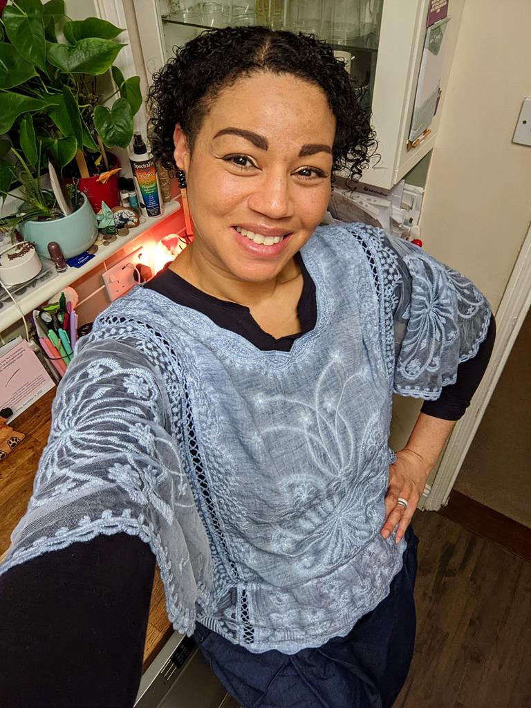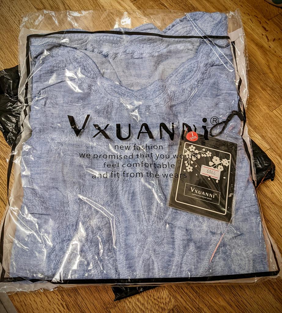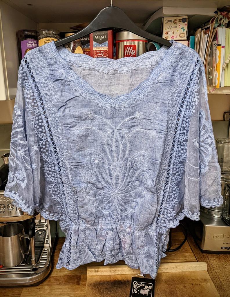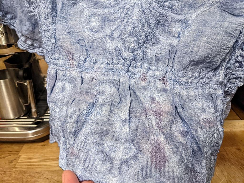 Gorgeous!!! I cannot recommend this enough! One note though: I noticed some faint pinky-purple marks on the skirting of this beautiful top. I think it looks a little like 'Tie dye' and myself and my husband doesn't think it's particularly noticeable, unless under very bright light and scrutiny. You may just be able to see it on the second photo. It may be that the marks are meant to be there, as a colour fade effect, but if not, I love the top too much to find this an issue. I mention this in case you order one and find the same but were expecting it to be a solid blue. I will try and add a photo of me wearing it at a later point. I have washed it and tried it for size, which is just right. For now here are some photos...