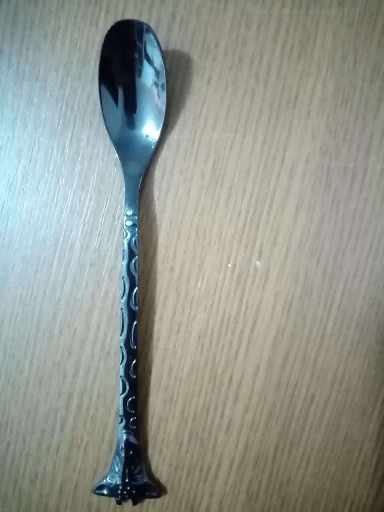 Small silver giraffe spoon. The product is quite thick, which suggests good quality. To see in use. But the spoon is pretty!