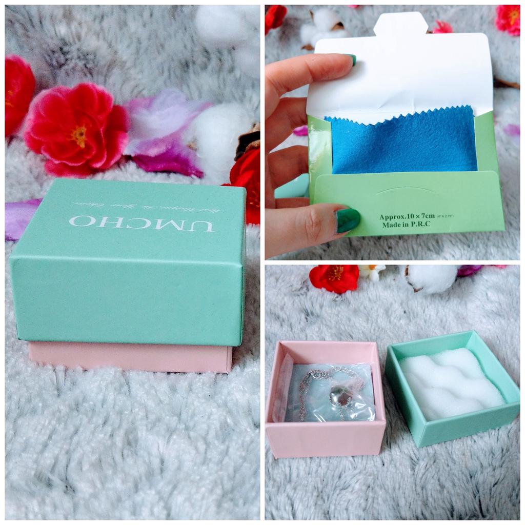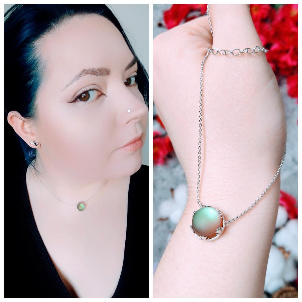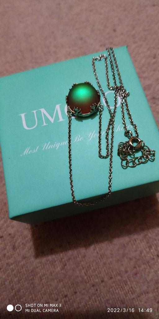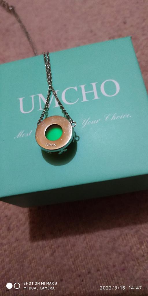 ⭐⭐⭐⭐⭐ Necklace with matte green stone - umcho The order was delivered in 15 days as a registered mail and was well packed in a bubble envelope. In addition, the goods were packed in their own box . This is a beautiful real silver necklace from the brand "UMCHO", which is made a little longer than a choker and has a pretty matt, round stone in the pendant's setting, which shimmers greenish or reddish depending on the incidence of light. I made a little video for you so you can see the effect better. The chain is delicately worked and has a mini carabiner as a clasp. The length can be minimally influenced by the choice of eyelets. The chain is silver, as for the stone I'm guessing acrylic or resin because it's very light. The workmanship is really high quality and I could not find any defects. I am really very satisfied with the product and the seller and would be happy to recommend both.