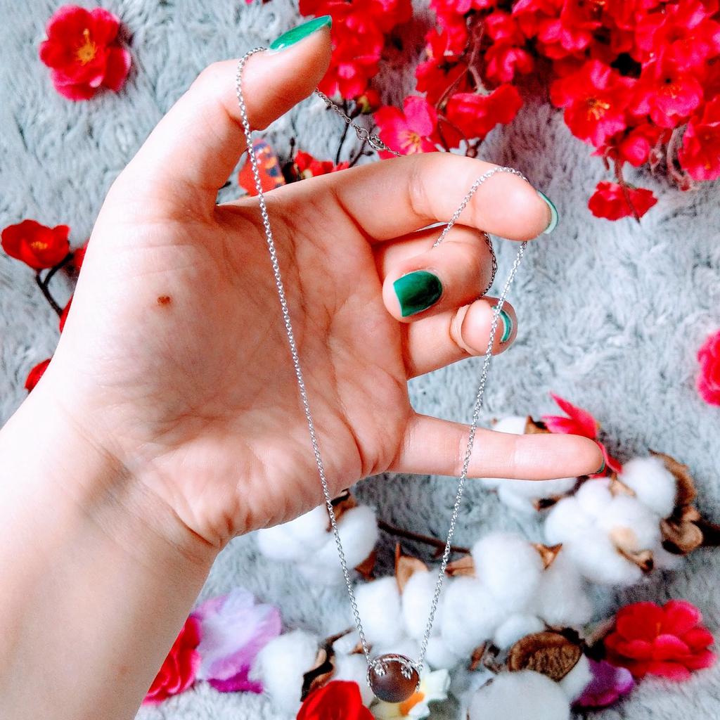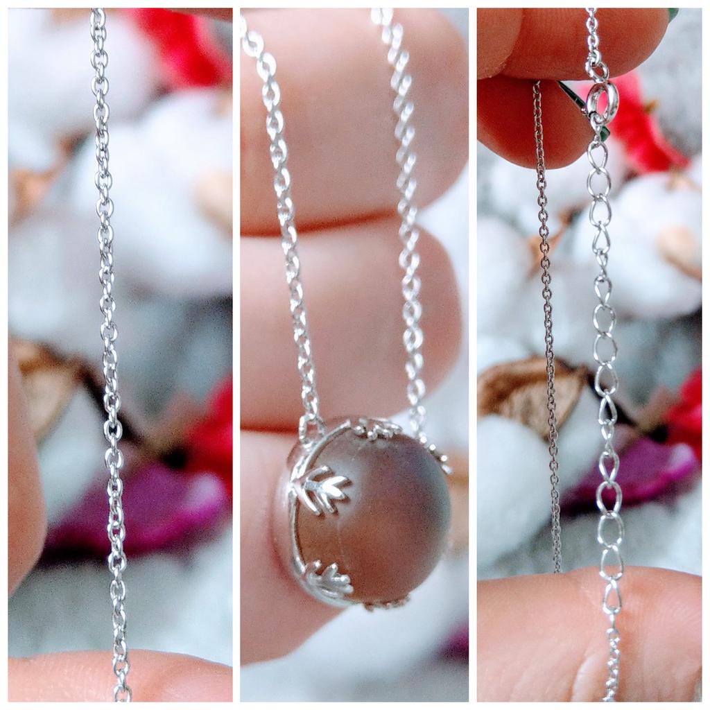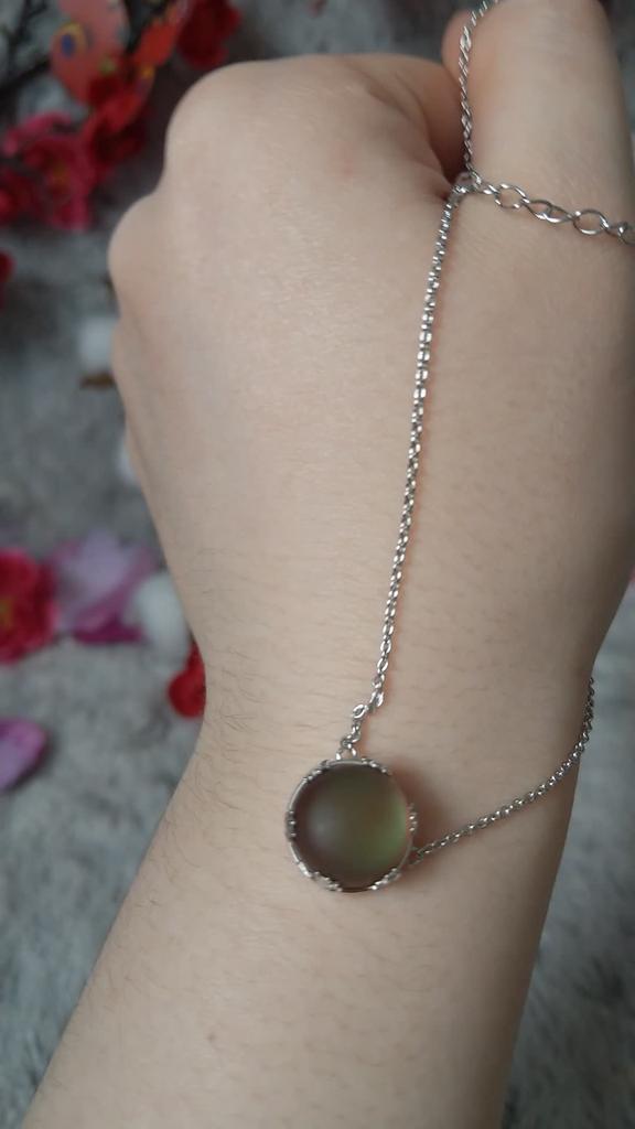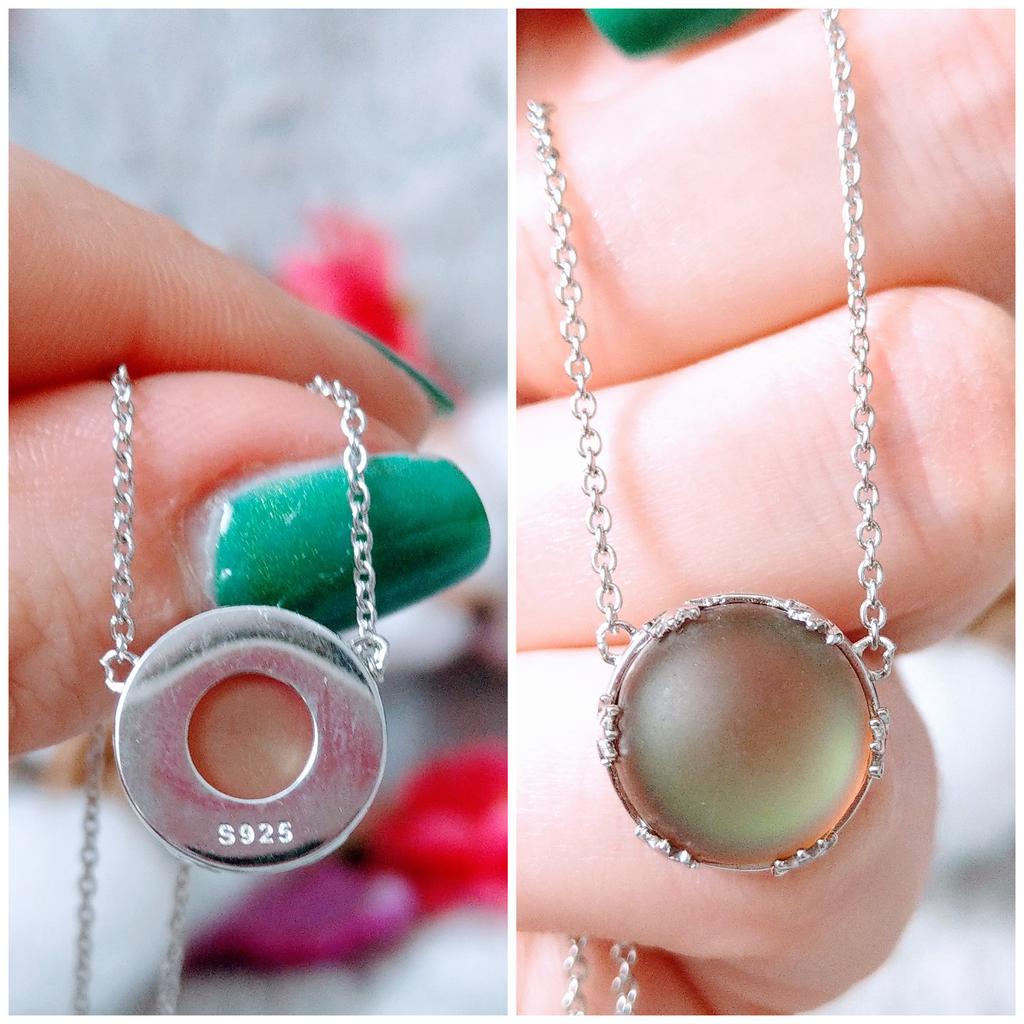 ⭐⭐⭐⭐⭐ Necklace with matte green stone - umcho The order was delivered in 15 days as a registered mail and was well packed in a bubble envelope. In addition, the goods were packed in their own box . This is a beautiful real silver necklace from the brand "UMCHO", which is made a little longer than a choker and has a pretty matt, round stone in the pendant's setting, which shimmers greenish or reddish depending on the incidence of light. I made a little video for you so you can see the effect better. The chain is delicately worked and has a mini carabiner as a clasp. The length can be minimally influenced by the choice of eyelets. The chain is silver, as for the stone I'm guessing acrylic or resin because it's very light. The workmanship is really high quality and I could not find any defects. I am really very satisfied with the product and the seller and would be happy to recommend both.