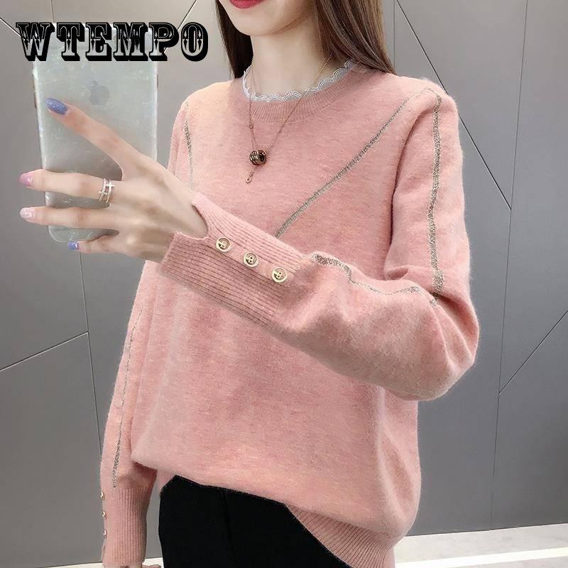 Pofulove Women Lace Round Neck Button Long Sleeve Sweater Slim Warm Pullover Undershirt Sweatshirts — buy online with free worldwide shipping!