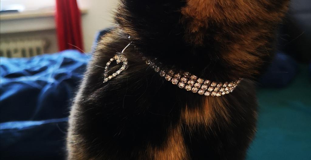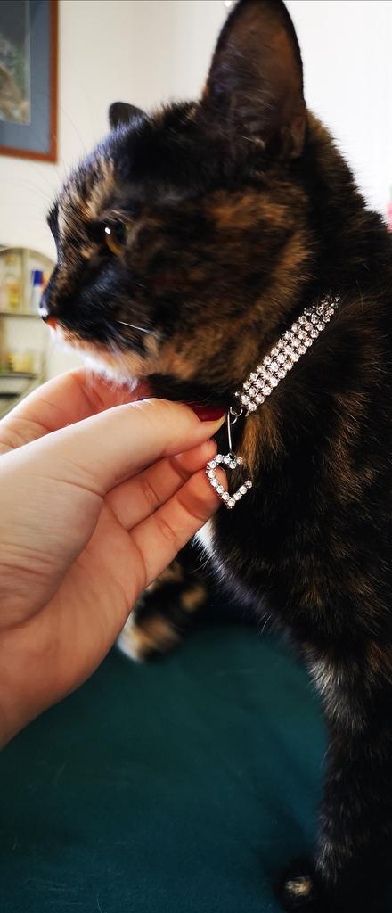 💎💎💎 Pet Collar 💎💎💎 Pet collar with small sparkling crystals 💎 For dogs or cats 💎 The collar is for my youngest house cat. 💎 Perfect for domestic cats or small dogs 💎 The closure works with a hook 💎 The band is made of rubber and stretches 💎 The workmanship is neat, none of the small stones are loose or have already fallen out 💎 The heart is pretty, but you can also easily remove it For my cat (2 years old and about 3kg) I took size S and it fits perfectly. I am very satisfied with the product and would happily recommend it 💎 LG Meli 💎