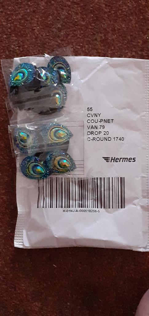Delivery took longer than usual to come but am happy to have finely got them . They really nece pretty little peacock feathers color and design resin drops with flat backs. Would of been really good if they came with holes drilled already in them . But not a problem just going to have to do it myself. Really pleased with my order cant wait to make something out of them .