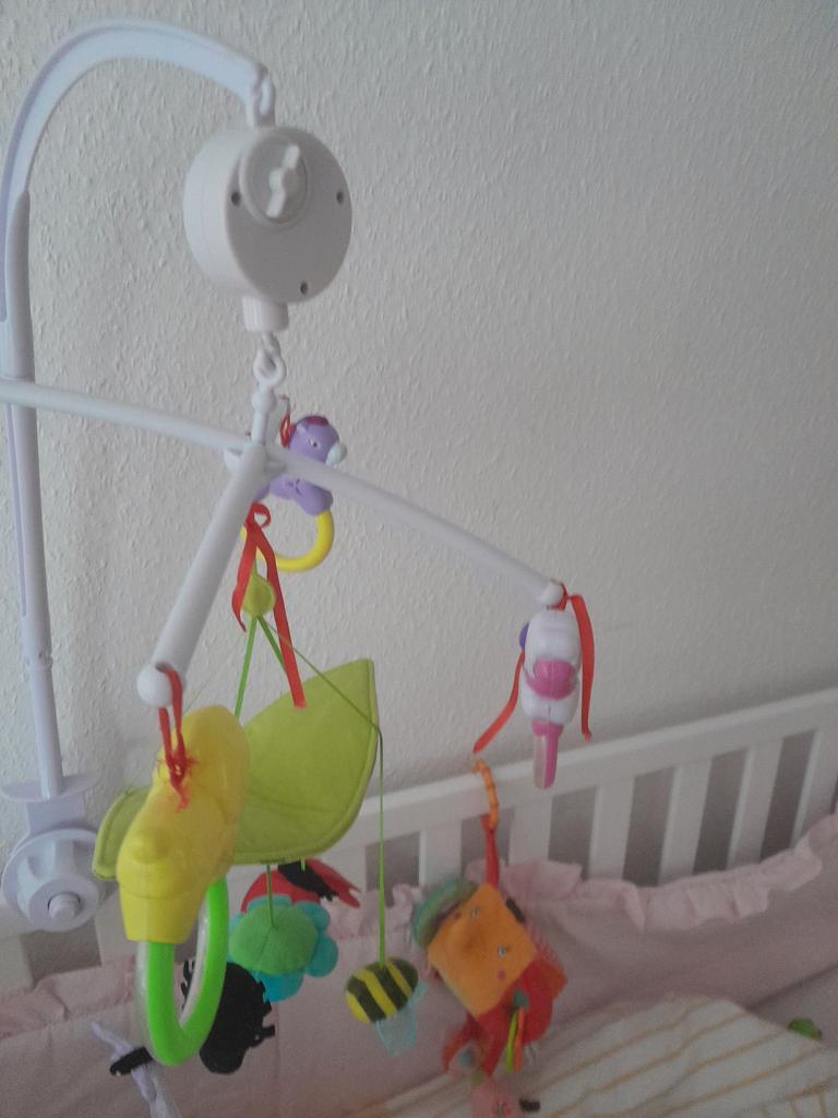 A regular mobile block, just white, without images. I would have liked it to wind up for longer than 1.5 turns, but thank you for that too. There is a button, more like a switch for turning off and modes. There is a regular mode and a faster one.. Overall, the block was liked by both us, the parents, and the child.. We've been using it for about a month now. It turns out it just has a stiff mechanism at the beginning. One wind-up lasts for about 3-5 minutes. The little one likes it, you can buy it.