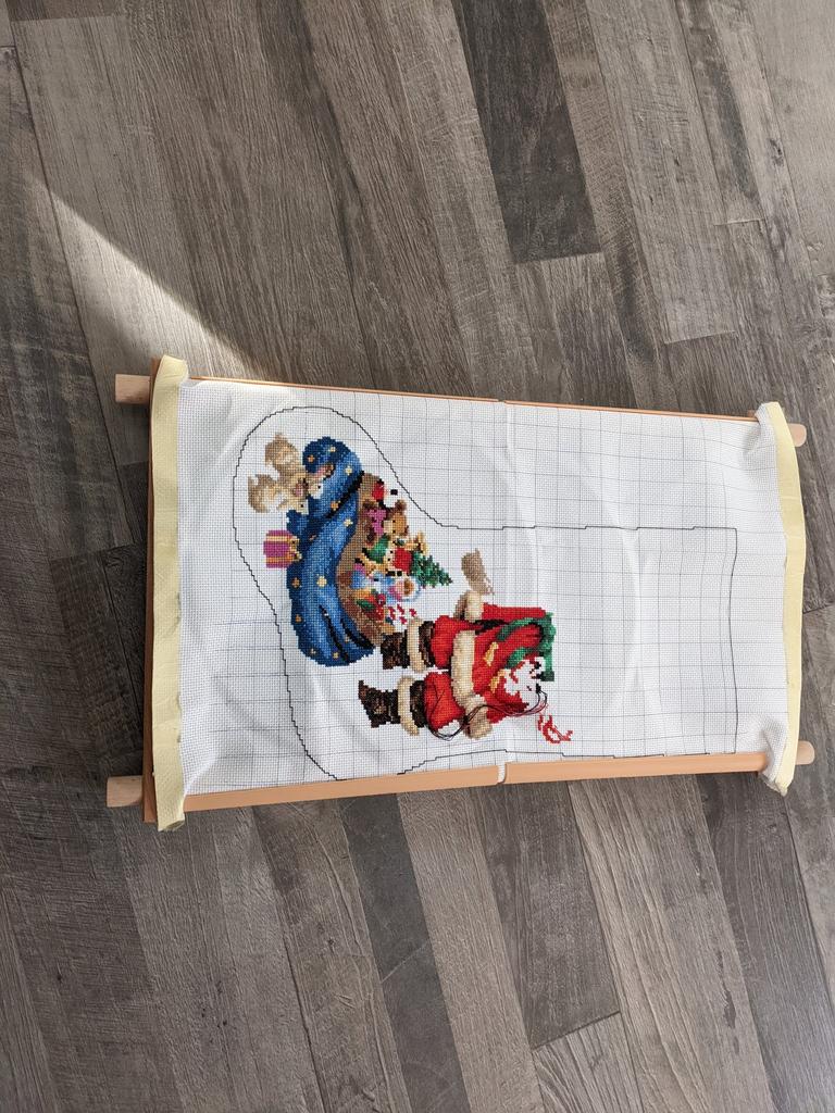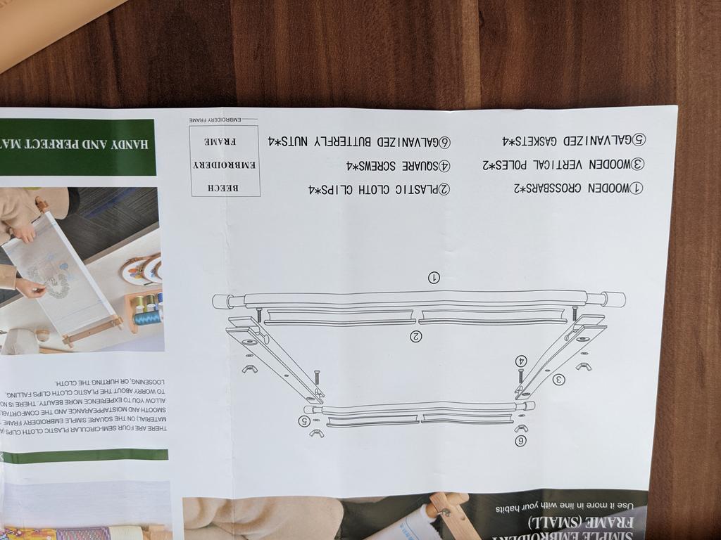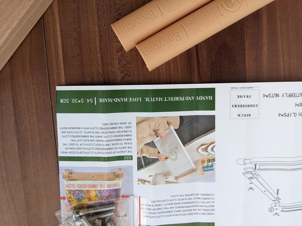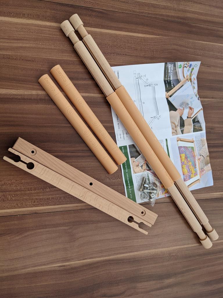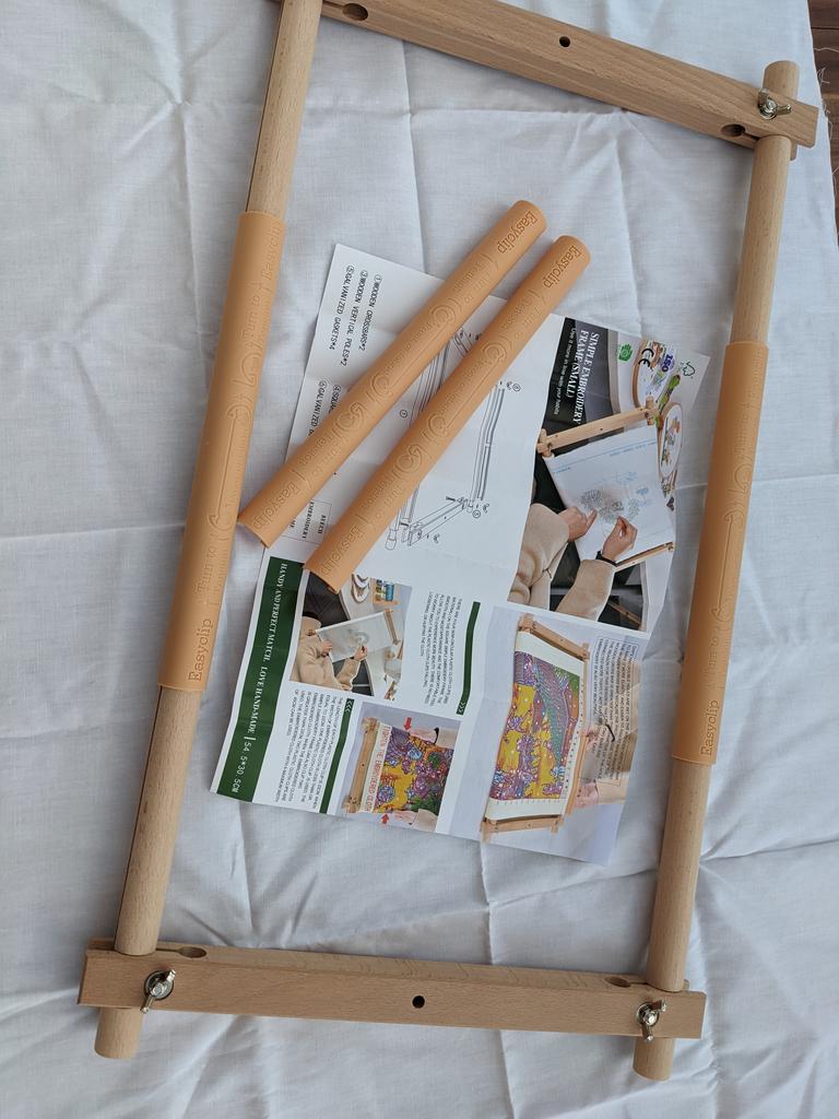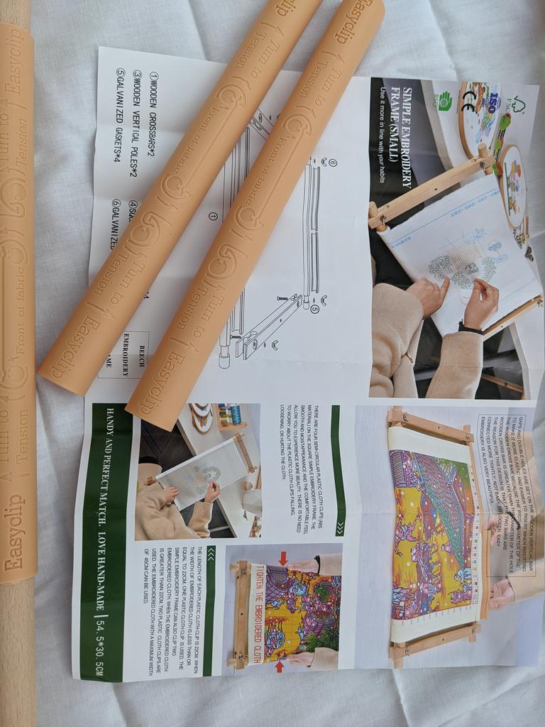 wooden embroidery frame, inside dimensions are 46 x 25.5 cm The frame is made of wood and the clips to the fabric clamp in plastic. Both are very well made and easily assembled in 2 minutes. Useful for every DIY friend. There are suggestions on Instagram queen.of.creative.ideas
