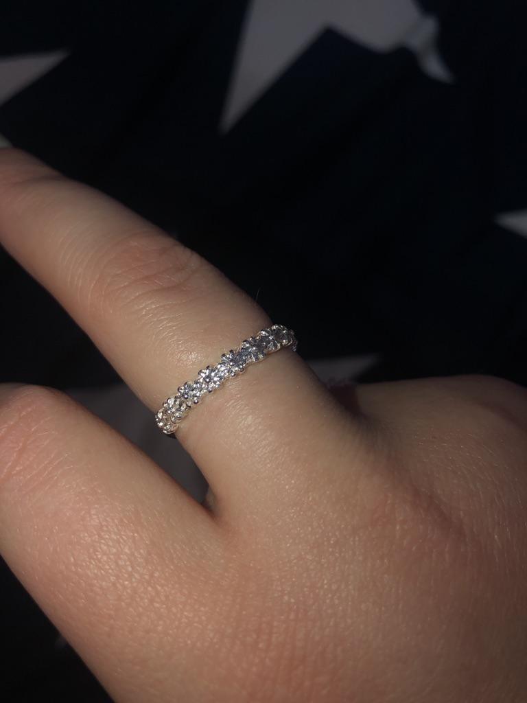 Lovely ring and a nice fit. It hasnt tarnished or lost any of it's sparkle after 7 days of constant wearing. It looks good on - pity about my wrinkley hands