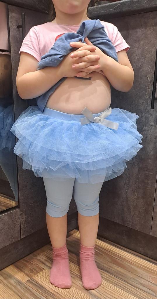 The child is 104 cm tall, not thin, size 110 fit well, only the elastic is a bit tight.. Looks beautiful, sewn well, the skirt is fluffy.