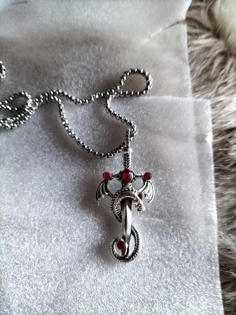 This is a gorgeous dragon necklace. The chain is long but it would look good with another necklace to contrast it. It's a beautiful piece of jewellery!