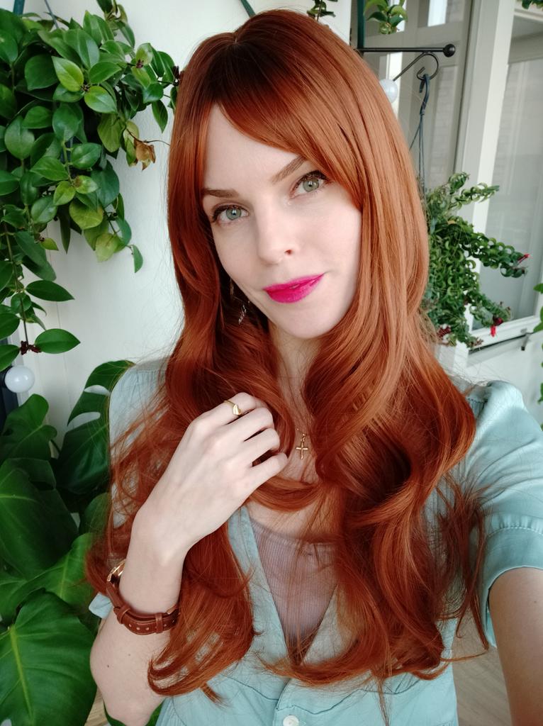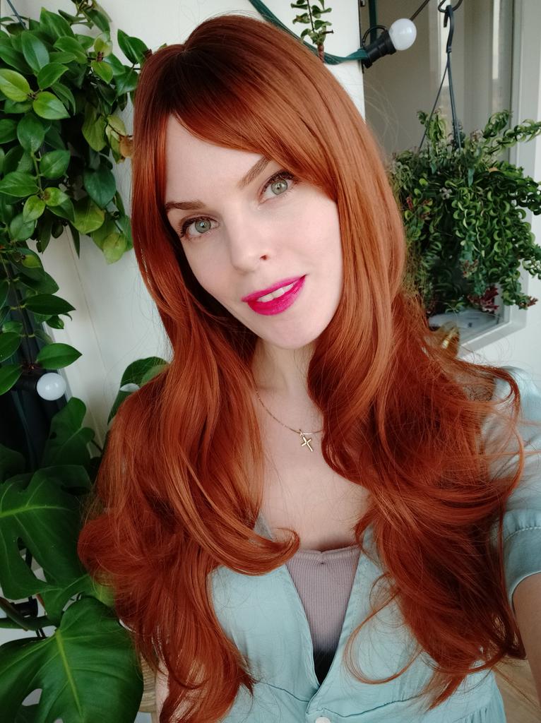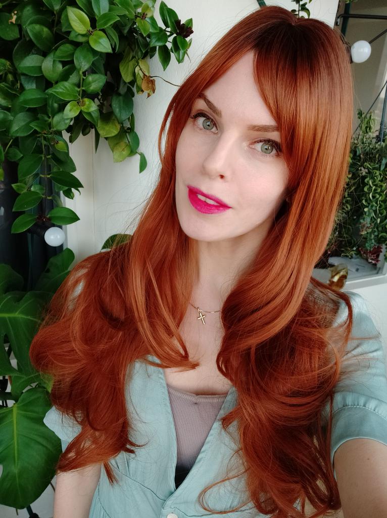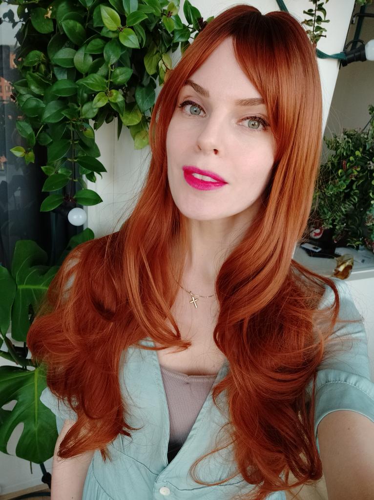Astonishing red wig from Alan Eaton 💕 Shipping took a bit long this time, it arrived in almost 5 weeks at home. The hair is very thick and it has a wavy / curly bottom. I also love the bangs, which are quite long. You can wear it to the sides, like I do, or cut them yourself. It looks and feels very soft and natural! It arrived with a wig cap, which looks like a panty! 😂🦵 🎉 8OB7TZ0IU9 🎉 Buy now with 5% off! ✔️🛒