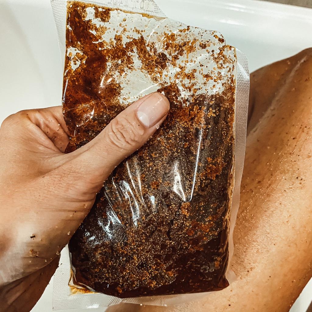 Coffea (Coffee) Seed Powder, Sodium Chloride (Dead Sea Salt), Olea Europaea (Olive) Fruit Oil, Vitis Vinifera Seed Extract, Prunus Amygdalus Dulcis (Sweet Almond) Oil, Sesamum Indicum (Sesame) Seed Oil, Mel (Honey), Zingiber Officinale Root Powder, Chili Pepper Seed Powder