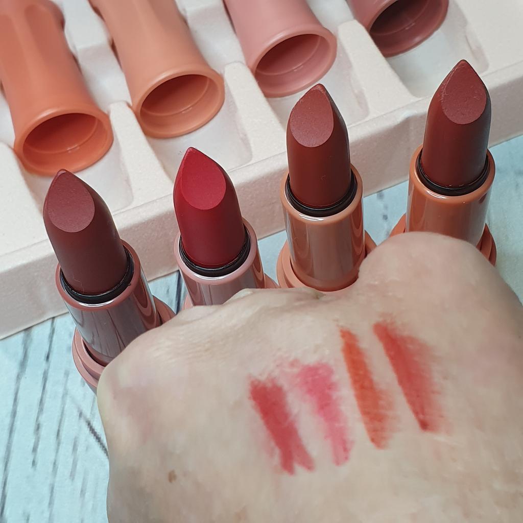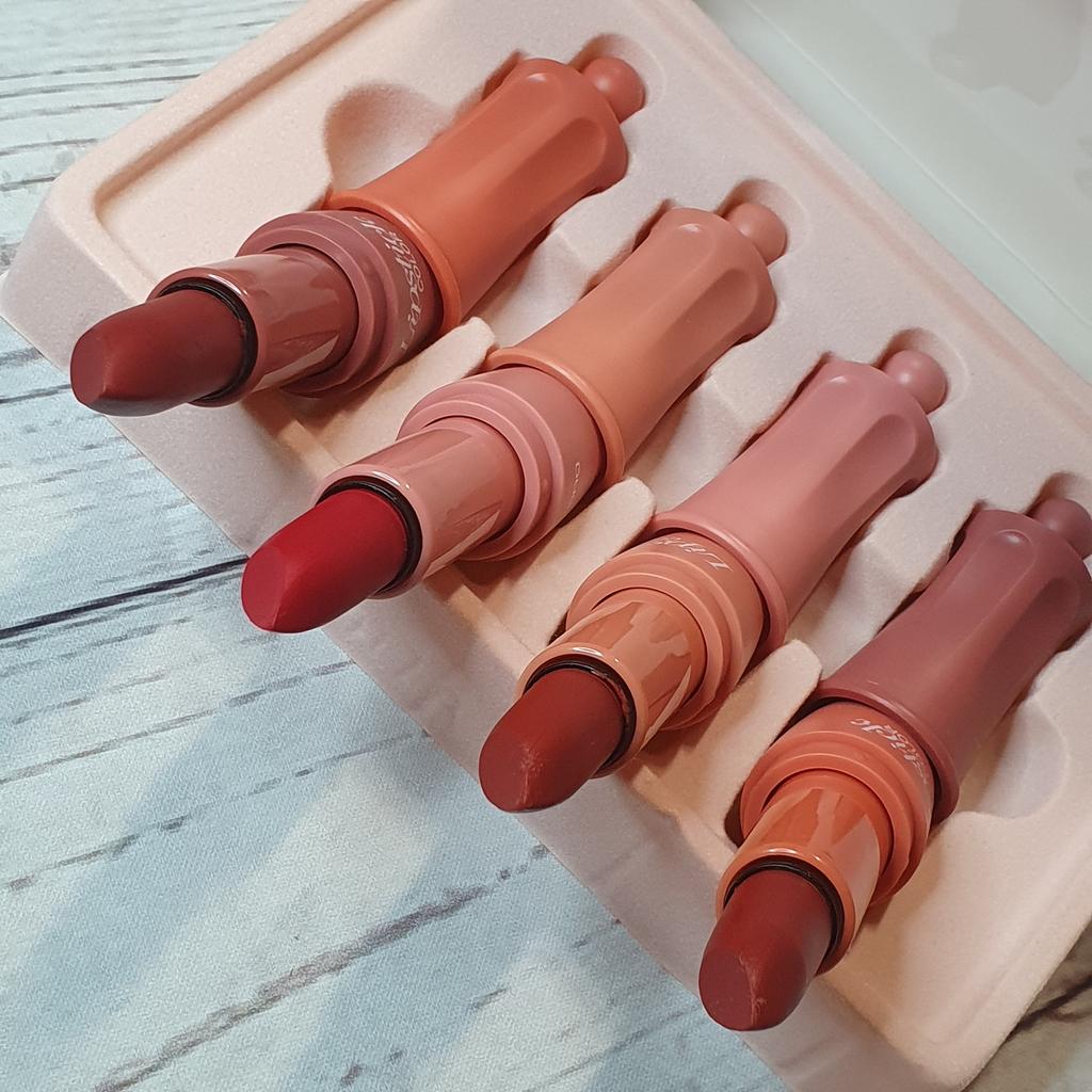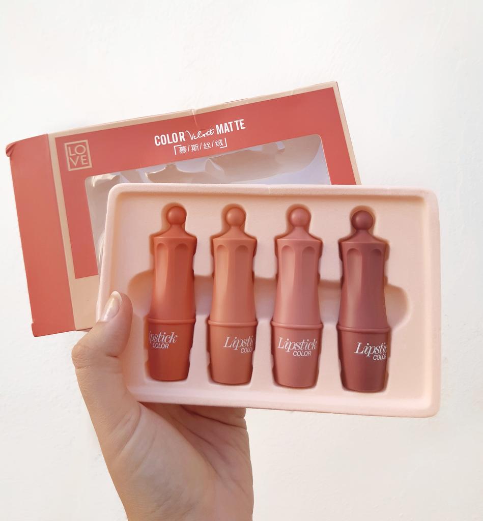 *Set of 4 lipsticks💄 . The arrival time has been 20 days to Spain (it's fine) It came well wrapped in its plastic box (it is a sign that they have not been used) . Contains 4 normal size lipsticks. They are presented in a cardboard box and a kind of cork. . The design of the lipsticks is nice, they have a little cap to open and close them when not in use. . The colors are very pretty, they do not dry out, so if we eat or drink we can stain them, they are rather dark tones. . Can be easily removed with the help of a wipe. . For more content you can follow me on IG: @mariterejimenezm