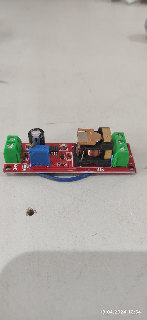 Today I wanted to use this relay, and it turns out it doesn't work. The relay itself clicks, there is a delay, but there is no power at the output. There is no plus or minus. After disassembling the relay (blue), I started checking it with a tester and it’s not clear how it works. Power goes to the coil and that's it, there is nothing else either at the input or at the output. I had to cut one track and solder two wires so that it would work as I needed, that is, power would be supplied after 10 seconds. The light turns on. See on the picture.