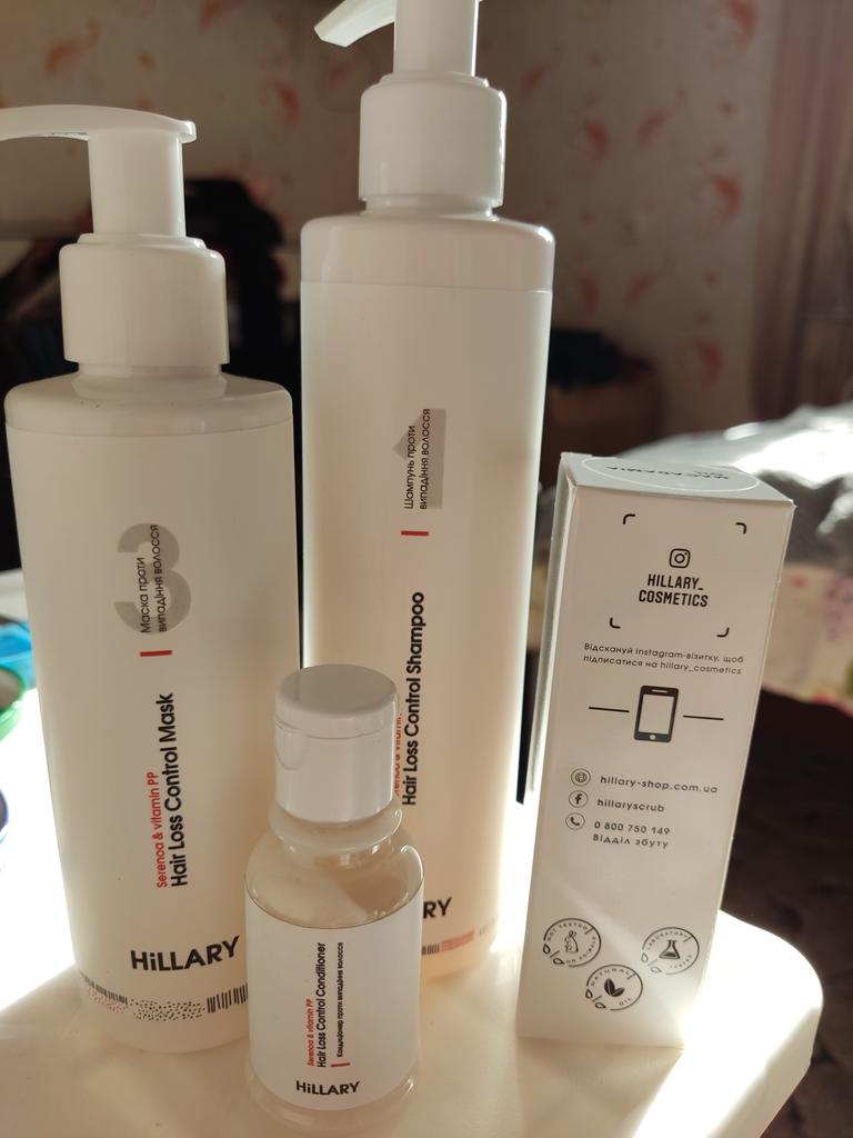 The set includes: Hillary Serenoa & PP Hair Loss Control anti-hair loss shampoo, 250 ml, Hillary Serenoa & PP Hair Loss Control anti-hair loss mask, 200 ml, Hillary Organic Cold-Pressed Macadamia Oil.