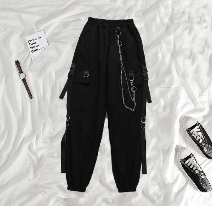 Black Cargo Pants Women Chain Trousers Female Streetwear — buy online with free worldwide shipping!