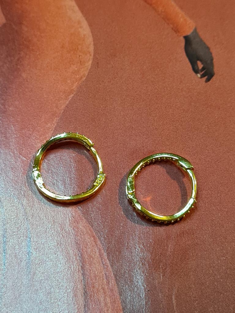 Miniature hoop earrings in gold style from Lindon.They will be perfect for women and girls.The zircon stones go along the front and on inside too.Very light,didn't cause any irritation,material is copper.Delivery 2.5 weeks to Ireland.Happy Shopping!