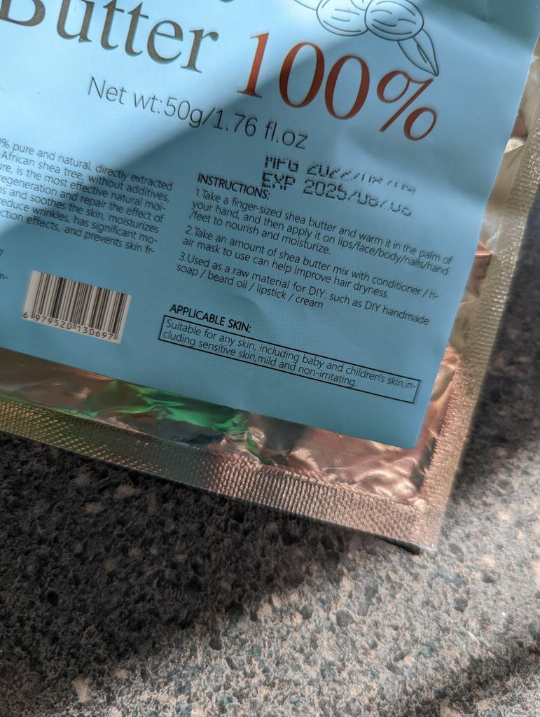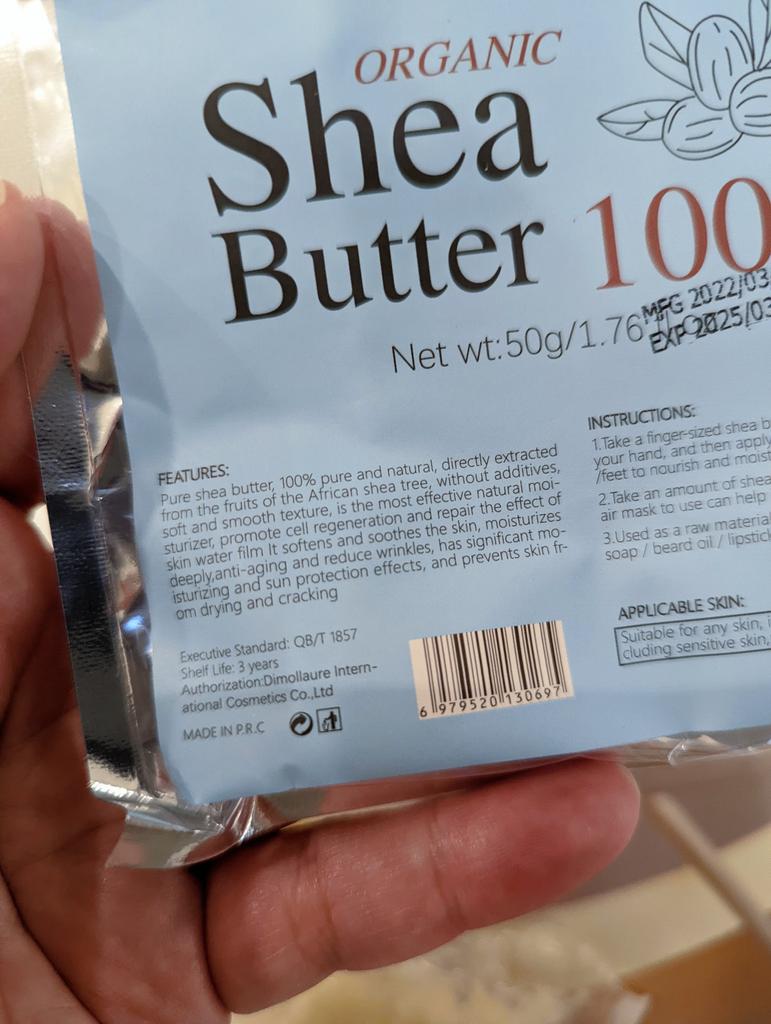 Shea nuts are widely distributed in Guinea and other places in Africa. The fruits are edible and the nuts are used to produce shea butter. Shea butter and sebum secretion of the human body's various indicators are close, containing a wealth of non-saponifiable ingredients, easy to absorb the body, can prevent dry skin and further restore and maintain the natural elasticity of the skin. At the same time can play an anti-inflammatory role. Shea butter is known locally as "Women's gold.".Came in zip back 50gr,this type is unrefined. How To Use: 1. Use it directly! Take a little in the palm of your hand and rub your hands to make the shea butter softer (shea butter becomes liquid at a high temperature, about 37 degrees.) Apply it to the skin; If you are afraid of a greasy feeling (shea butter is very nourishing) then the amount should be smaller. Use before going to bed, the effect is better and the shea butter absorbs quickly. 2. Can use in diy handmade soap, hand cream, lip balm is a good raw material, suitable for cream, lotion and other skin care products. Delivery took 3 weeks.Happy Shopping!