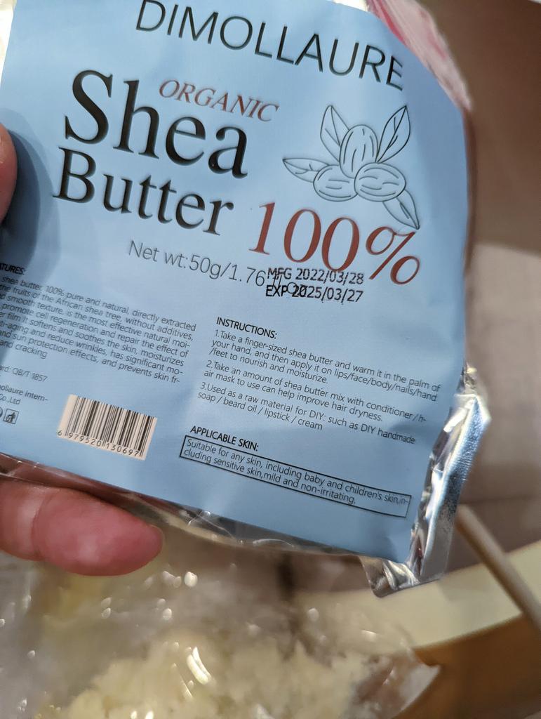 Unrefined Shea Butter Brand: DIMOLLAURE ⭐⭐⭐⭐⭐ I ordered it before and I really like it. So I reordered. It is suitable for all skin types, including baby skin! It is unrefined. The rest is the same: This shea butter is pure, unrefined and natural. Raw, unrefined shea butter is easy to spread. You can apply shea butter directly to your skin. Shea butter has so many ways of use: ❣️Just as it is, you can apply it to the face and body as a natural moisturizer ❣️In a shea butter lotion bar stick for easy use ❣️After sun exposure to replenish skin ❣️Alone or in a pregnancy salve to ward off stretch marks ❣️As a natural cuticle cream ❣️As the best under-eye wrinkle remover and bag-reducer ❣️As a massage butter ❣️In homemade velvety soft whipped body butter ❣️On sore/raw noses during a cold or flu ❣️Added to basic homemade lotion ❣️On scars to naturally help collagen production ❣️As a base for homemade deodorant ❣️By itself for low-grade sun protection ❣️Whipped into magnesium body butter ❣️As a natural baby-care product (alone) or ingredient in baby care recipes ❣️By itself on the lips or in homemade lip balms ❣️In a homemade shimmer lip balm ❣️On the eyelids before applying makeup to make it last longer ❣️To improve skin elasticity (some even say it helps with cellulite) ❣️On the hair or scalp (in mixture with other natural ingredients) ❣️In homemade liquid creme foundation and makeup *wellnessmama.com Benefits of Shea Butter: 1) It boosts skin moisture without clogging pores. 2) Its anti-inflammatory properties soothe skin problems 3) It could heal cuts and scrapes 4) It helps fight breakouts 5) Antioxidants may mean anti-aging properties It comes within a sealed zipper bag. You can get as much as you need and save the rest in a zipper bag to protect. The net amount is 50g / 1.76 fl oz