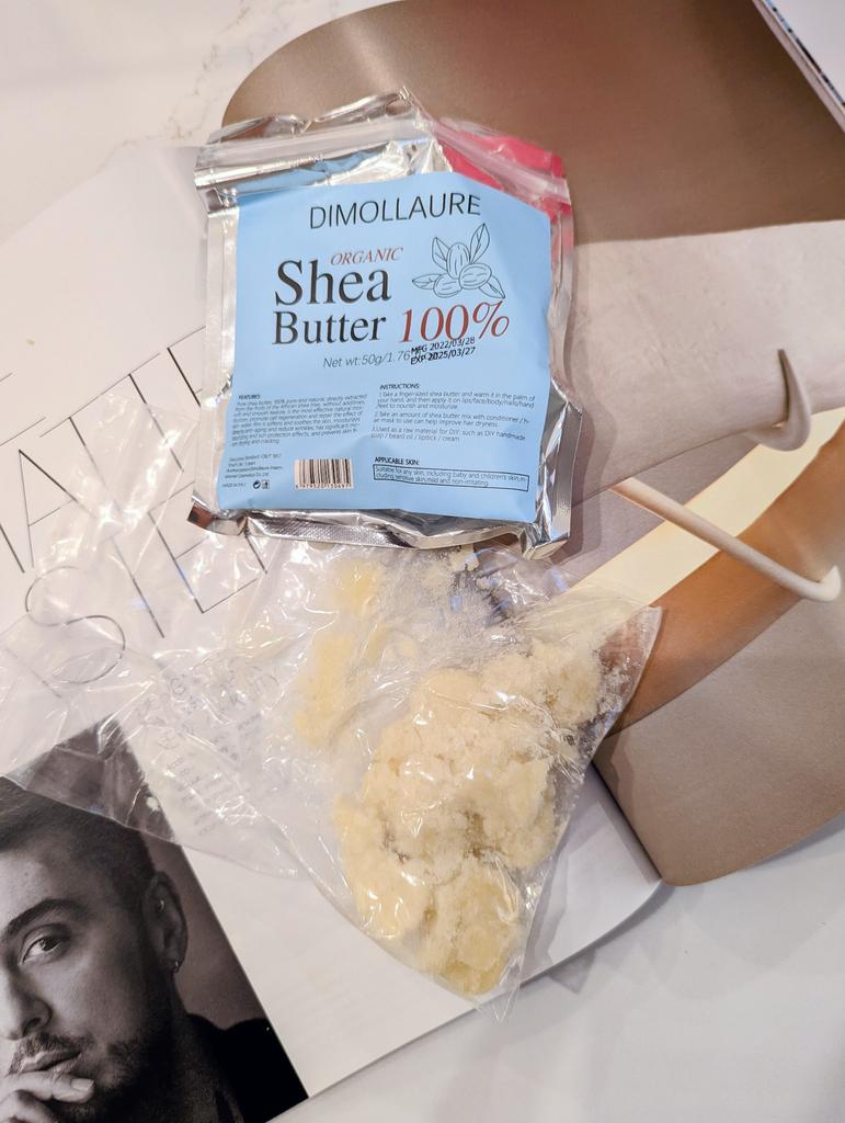 Unrefined Shea Butter Brand: DIMOLLAURE ⭐⭐⭐⭐⭐ I don't know if this brand DIMOLLAURE has a relationship with Chumolee brand. But judging by the packaging and labels on both, I feel like they are sister companies 🤷🏻♀️. So I wanted to try this Shea Butter also to see if there is a difference in quality. I will just jump into conclusions 😅😅😅 and say "there is no difference in quality, both are high quality Shea butters" The rest is the same: This shea butter is pure, unrefined and natural. Raw, unrefined shea butter is easy to spread. You can apply shea butter directly to your skin. Shea butter has so many ways of use: ❣️Just as it is, you can apply it to the face and body as a natural moisturizer ❣️In a shea butter lotion bar stick for easy use ❣️After sun exposure to replenish skin ❣️Alone or in a pregnancy salve to ward off stretch marks ❣️As a natural cuticle cream ❣️As the best under-eye wrinkle remover and bag-reducer ❣️As a massage butter ❣️In homemade velvety soft whipped body butter ❣️On sore/raw noses during a cold or flu ❣️Added to basic homemade lotion ❣️On scars to naturally help collagen production ❣️As a base for homemade deodorant ❣️By itself for low-grade sun protection ❣️Whipped into magnesium body butter ❣️As a natural baby-care product (alone) or ingredient in baby care recipes ❣️By itself on the lips or in homemade lip balms ❣️In a homemade shimmer lip balm ❣️On the eyelids before applying makeup to make it last longer ❣️To improve skin elasticity (some even say it helps with cellulite) ❣️On the hair or scalp (in mixture with other natural ingredients) ❣️In homemade liquid creme foundation and makeup *wellnessmama.com Benefits of Shea Butter: 1) It boosts skin moisture without clogging pores. 2) Its anti-inflammatory properties soothe skin problems 3) It could heal cuts and scrapes 4) It helps fight breakouts 5) Antioxidants may mean anti-aging properties It comes within a sealed zipper bag. You can get as much as you need and save the rest in a zipper bag to protect. The net amount is 50g / 1.76 fl oz