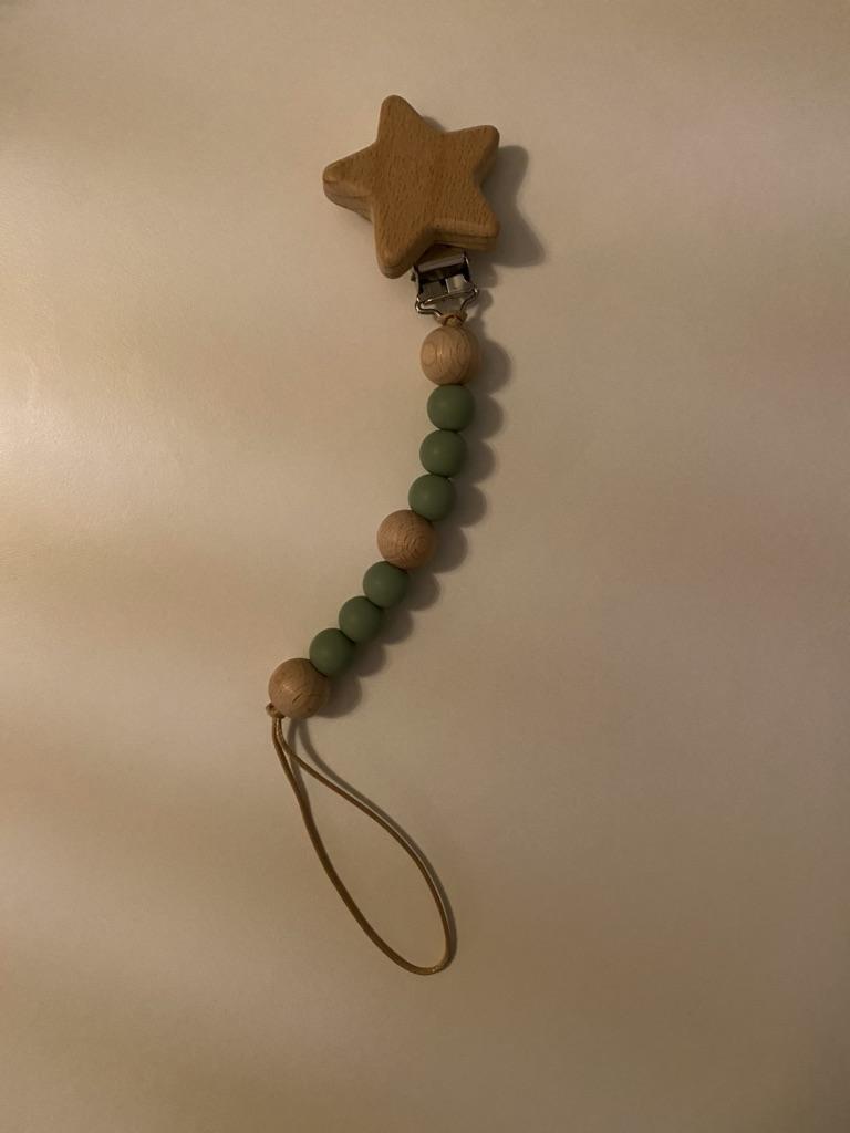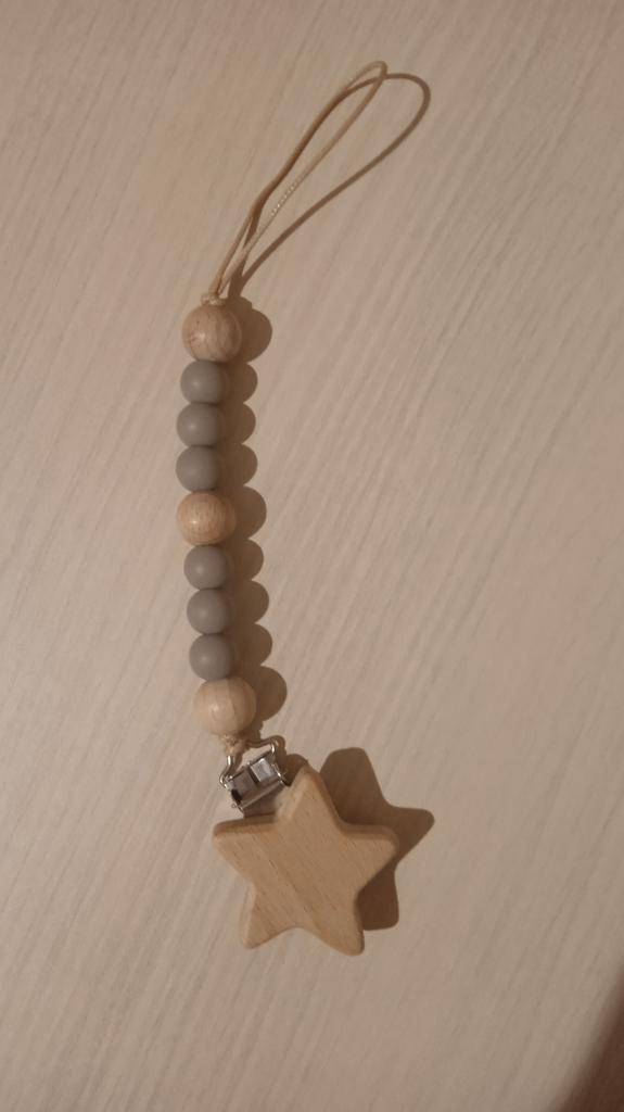 Beautiful, quality materials — wood and silicone. Could be also used as a teether.