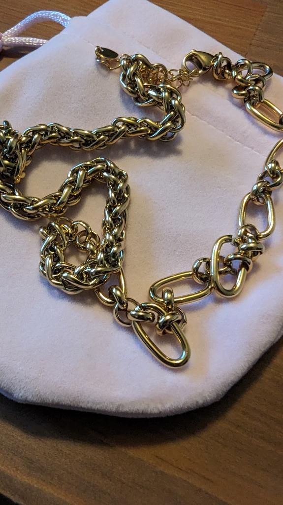 A wonderful and high-quality chain. Looks fantastic! Comes in a velvet pouch and a small plastic snap ring. Thank you! 💙💛