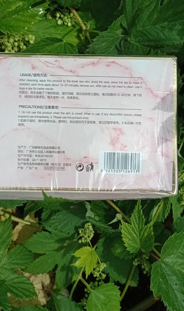 In the box 10 pairs of patches,white colour,jelly like substance with pleasant aroma.Each pair individually packed.They are collagen eye masks with hyaluronic acid to help moisturize the area,smoothen fine lines and and lighten dark circles.Can use them cold from the fridge for puffiness.Delivery tool 3 days.Happy Shopping!!!