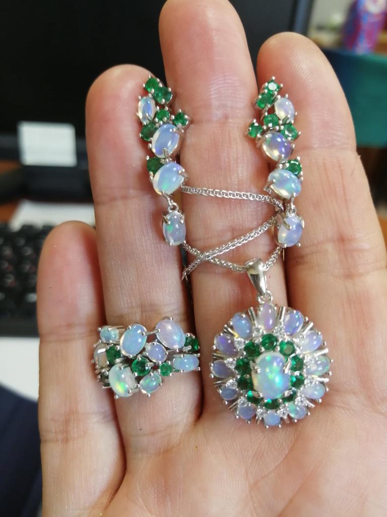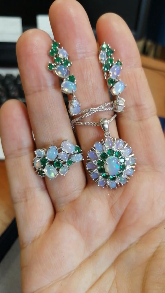 New Design Fancy Opal Emerald Jewelry Set Natural Gemstone 925 Sterling Silver Ring Clasp Earring Women Nice Gift