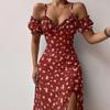 Summer Elegant Off Shoulder Floral Print Slim Dress Sexy Sling Ruffle Strapless Slit Party Dress Women V Neck Long Dress 21764