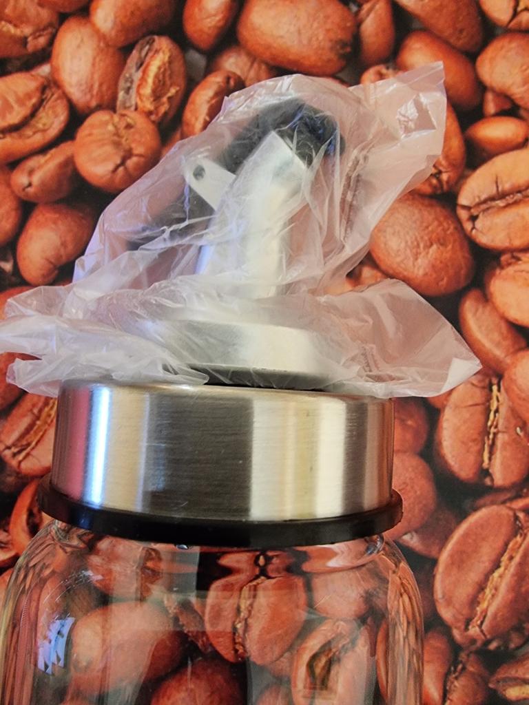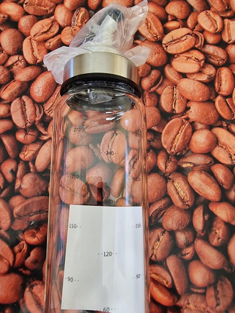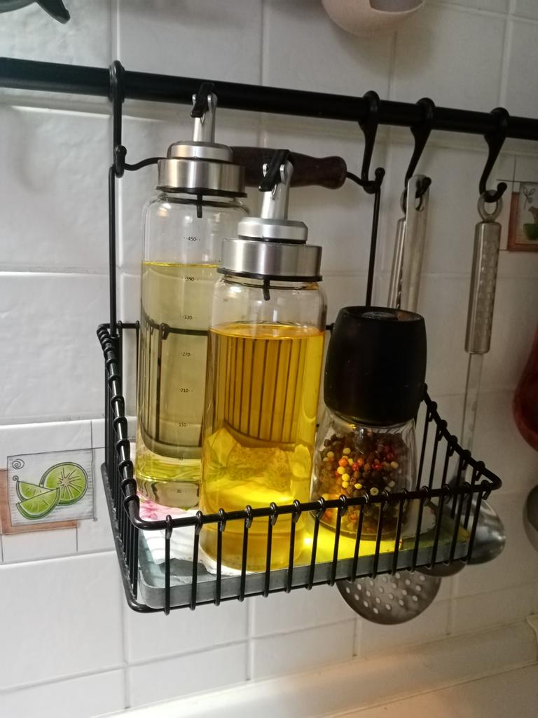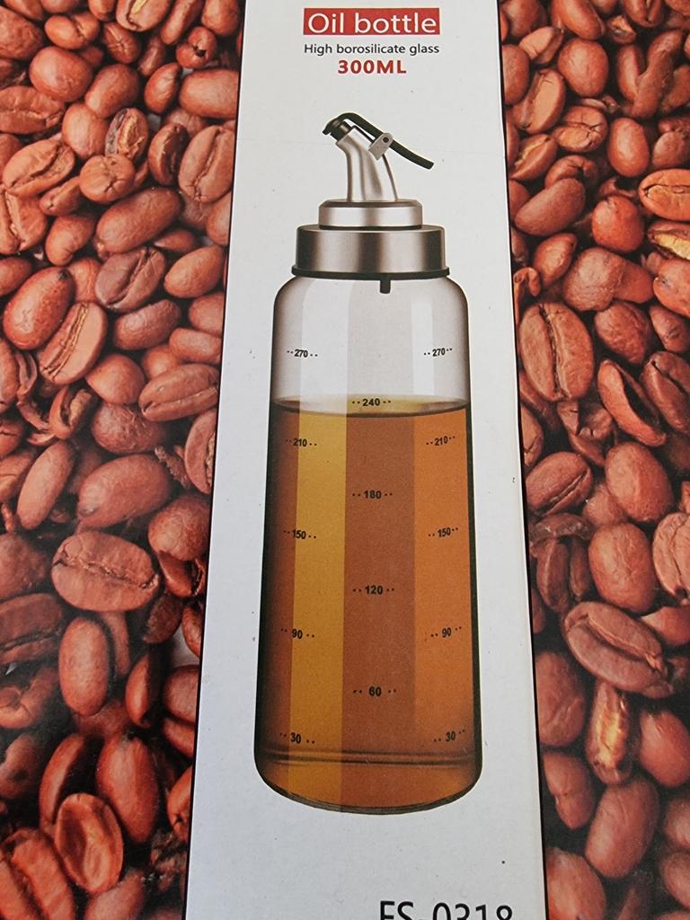 Oil bottle, glass, good quality. The gaskets hold the oil well, no drips anywhere.