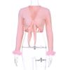 Long Sleeve Fur V-neck Wrapped Bandage Sexy Crop Tops Autumn Winter Women Streetwear Club Party Outfits T-shirts
