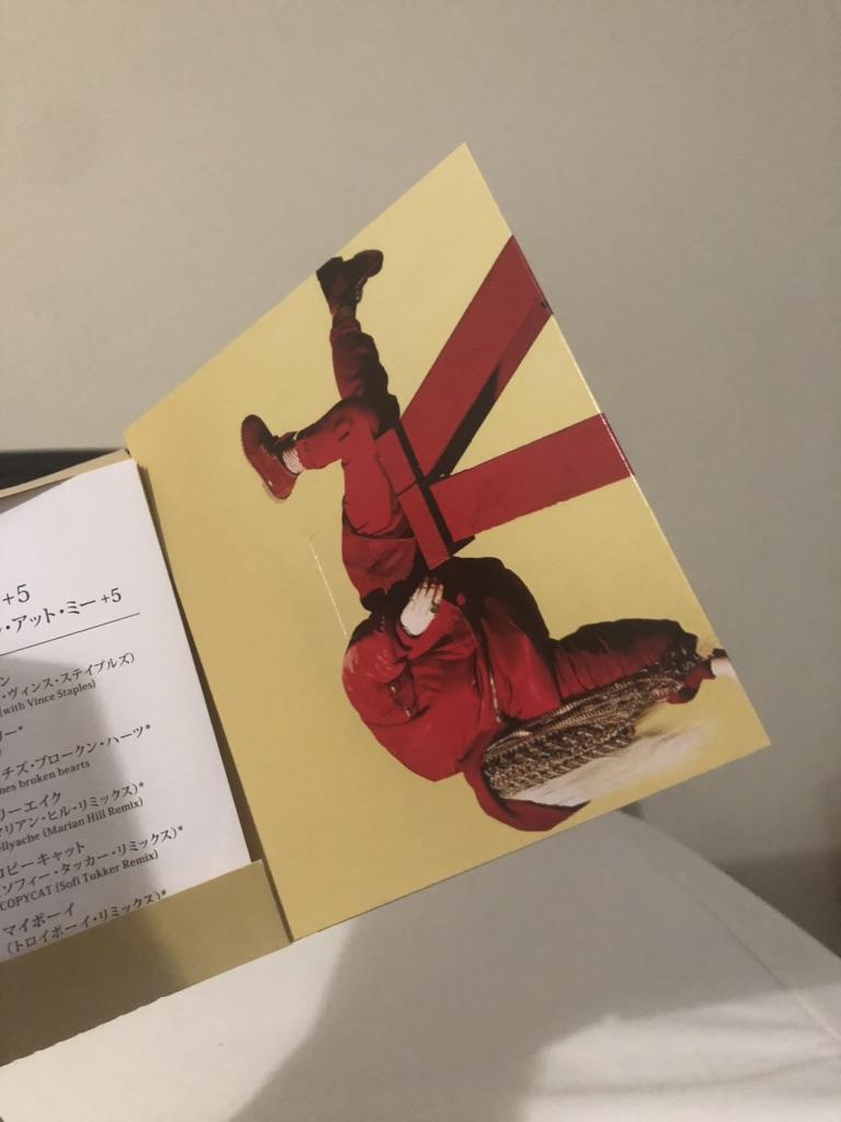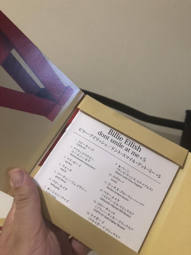 Billies Eilish - Don’t Smile At Me ( Japan Edition ) Much loved album with great songs from everyone's favorite Billie Eilish ! I wanted to make this purchase for a long time and I finally did it ! It came to me from Japan within 10 days, that is, very quickly ! Unfortunately I can't choose a favorite song because most of them are constantly on my playlist ! Track list 1 . COPYCAT 2 . idontwannabeyouanymore 3 . my boy 4 . watch 5 . party favor 6 . bellyache 7 . ocean eyes 8 . hostage Bonus Tracks : 9 . &burn ( with Vince Staples ) 10 . lovely 11 . bitches broken hearts 12 . bellyache ( Marian Hill Remix ) 13 . COPYCAT (Sofi Tukker Remix) 14 . MyBoi ( TroiBoi Remix ) ❤️