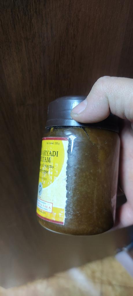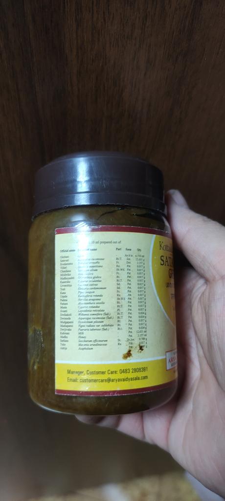 Ghee butter (Ghee) – 6.710 ml, Shatavari (Asparagus racemosus) – 12.631 g, Gokshura (Tribulus terrestris) – 3.157 g, Ipomoea Mauritiana (Ipomoea mauritiana) – 0.017 g, white sandalwood (Santalum album) – 0.017 g, Grapes (Vitis vinifera) – 0.017 g, Yashtimadhu (Glycyrrhiza glabra) – 0.017 g, Earthen almond (Cyperus esculentus) – 0.017 g, Cucumber (Cucumis sativus) – 0.017 g, real cardamom (Elettaria cardamomum) – 0.017 g, Pippali (Piper longum) – 0.017 g, Kaempferia (Kaempferia rotunda) – 0.017 g, Nervilia aragoana (Nervilia aragoana) – 0.017 g Alternantera Sedentary (Alternanthera sessilis) – 0.017 g, Musta (Cyperus rotundus) – 0.017 g, Reticulated Leptadenia (Leptadenia reticulata) – 0.017 g, Ashwagandha (Withania somnifera) – 0.034 g, Shatavari (Asparagus racemosus) – 0.034 g, Mudgaparni (Dysolobium pilosum) – 0.017 g, Mashaparni (Vigna radiata) – 0.017 g, Pueraria tuberosa (Pueraria tuberosa) – 0.034 g, Milk (Milk) – 12.631 ml, Honey (Honey) – 3.157 ml, Sugar cane (Saccharum officinarum) – 0.789 g, Maranta reed (Maranta arundinacea) – 0.017 g, Shilajit (Asphaltum) – 0.017 g.