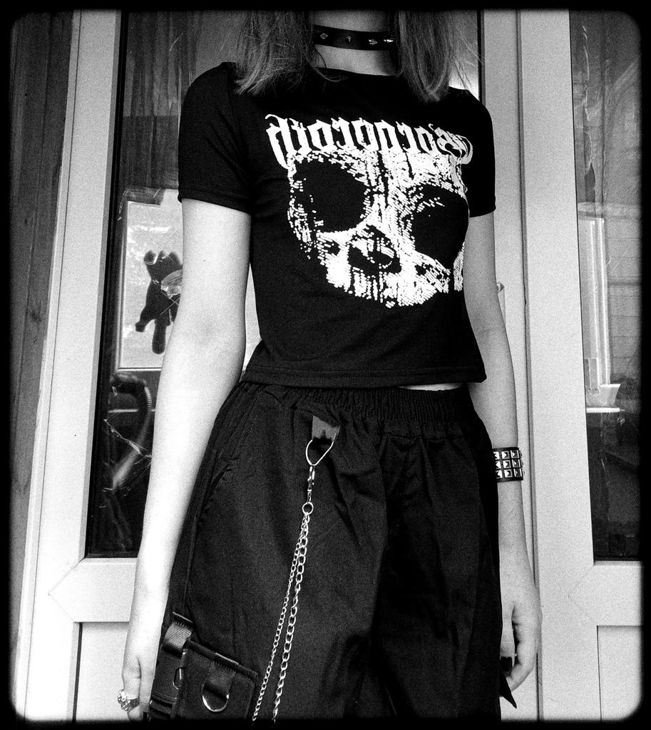Vintage Short Sleeve T-shirt 90s Gothic Harajuku Print Pattern Croptop Skeleton Skull Punk Streetwear Aesthetic Female Mujer Top