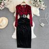 Autumn New Style of Celebrity Temperament V Neck Bronzing Printing High Waist Fold Stitching False Two Bag Hip Dress