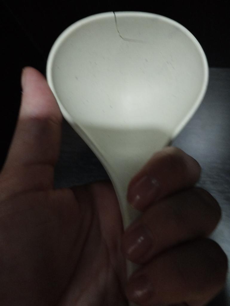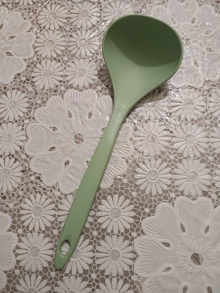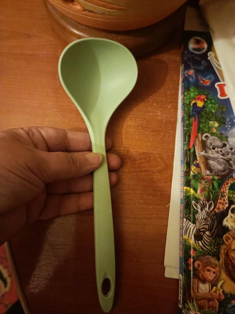 A very comfortable spoon. I use this one from the slow cooker. I pour the jam and put the salads into jars. Good quality. Plastic, bamboo type, odorless