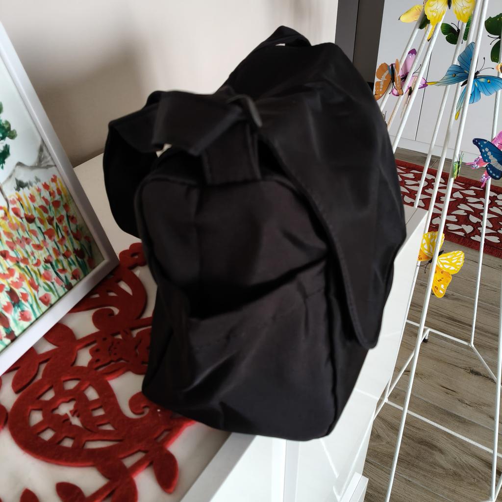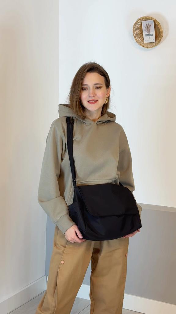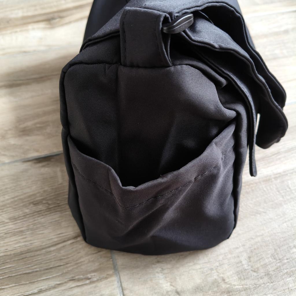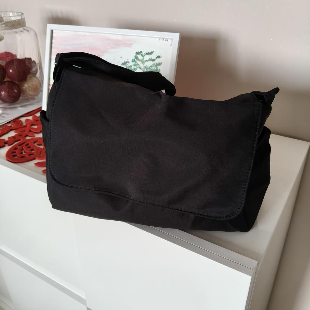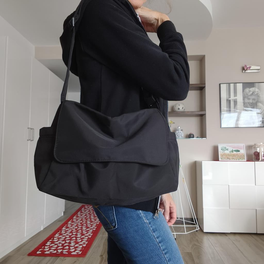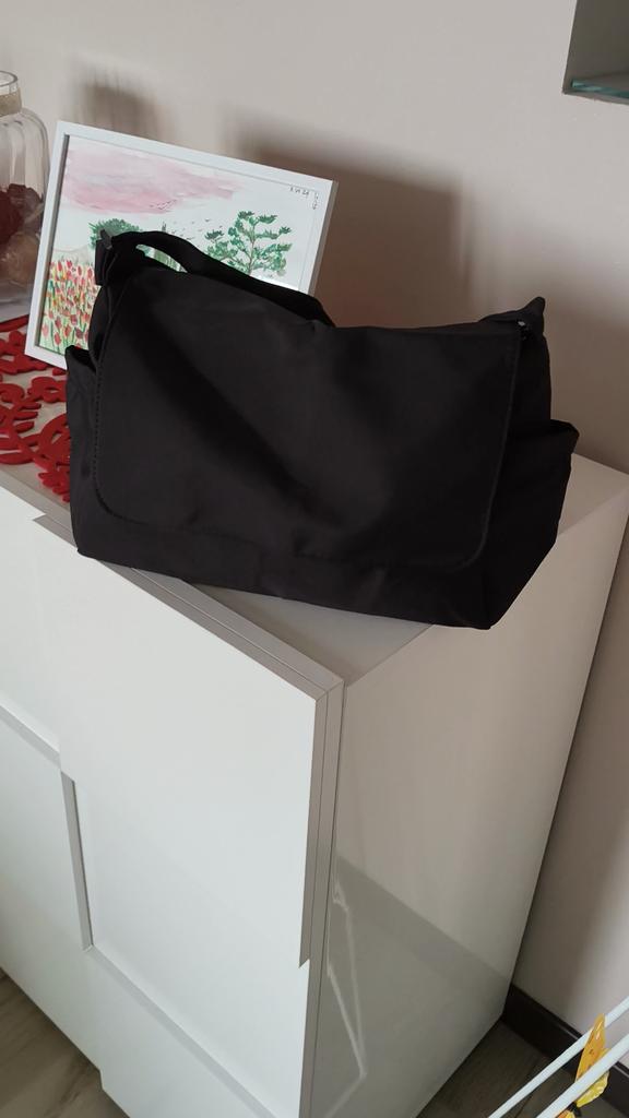 CROSSBODY BAG medium-sized shoulder bag with non-removable but adjustable shoulder strap. The bag has no internal pockets. On the outside, on both sides 2 open pockets. The bag is very spacious, has a soft structure and a zip closure. Side flap Available in various colors . I chose the color black Material: fabric of good thickness water-repellent. The bag is lined and washable . The seams are neat, no bad smells. Arrived in Italy in 20 days with tracked shipping. Packaging: cellophane wrap. An extremely low price !!! Recommended purchase 👌