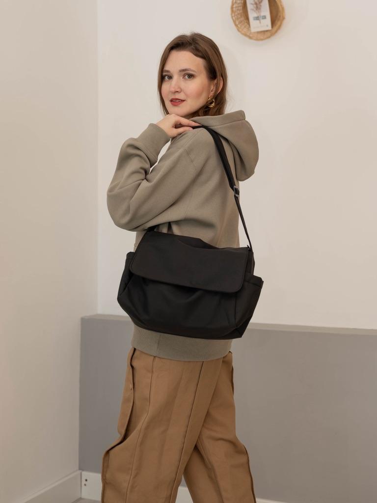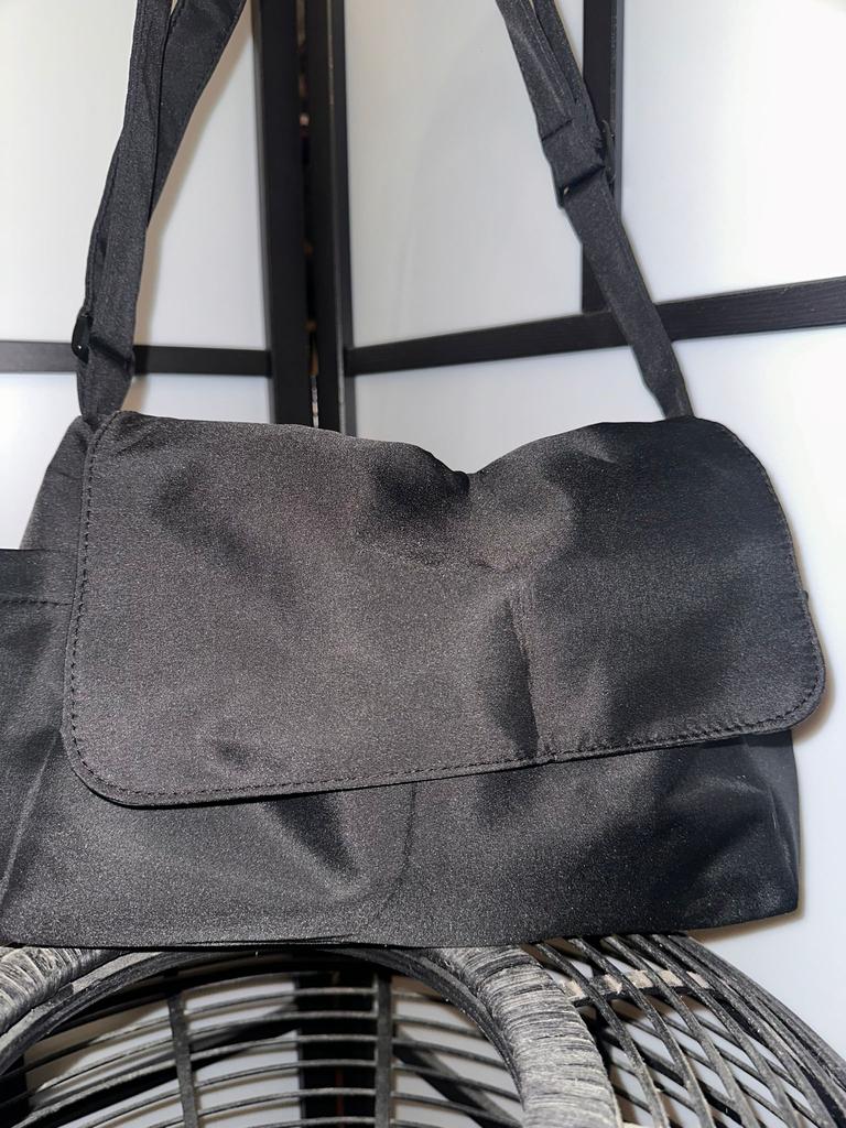 This black fabric bag combines simplicity and practicality in a lightweight and versatile design. Its satin finish adds an elegant and discreet touch, ideal for both everyday use and more formal occasions.. With an adjustable strap and flap closure, it is comfortable to wear on the shoulder or crossbody, offering enough space to carry the essentials without losing style. Its classic black color makes it a timeless basic that combines with any outfit.. A functional, lightweight accessory with a minimalist air that never goes out of style.