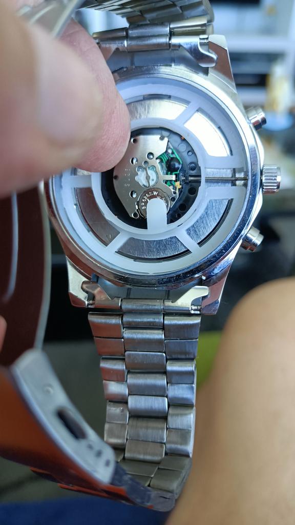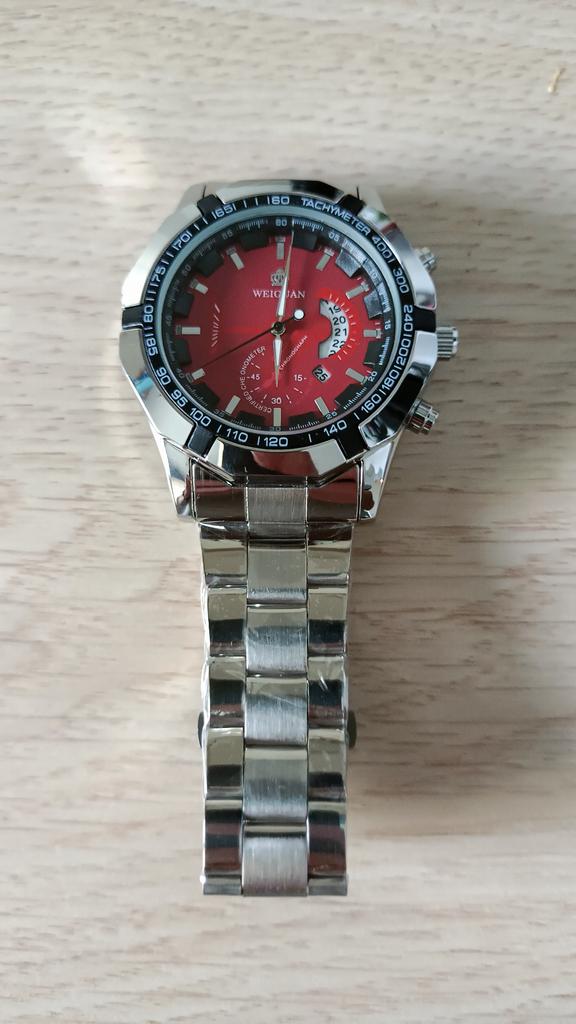 Cheapest version, both buttons cannot be pressed, just an illusion, the small red pointer is only printed on it, the display on the right dial, I don't know what it is supposed to show, the date display works, but you have to adjust it by turning the pointers, which takes forever, the bracelet has sharp edges and looks very cheap, was only delivered in bubble wrap, All in all scrap.