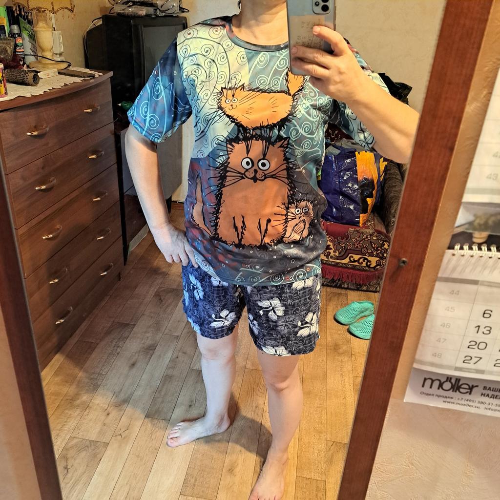 Bright and funny t-shirt, completely synthetic, but light and neatly sewn. Pleasant to the body, does not cling, but sits clearly on the figure. I ordered it for the gym, but now it is obvious that it is not suitable for sports. Will wear with something else - cute thing for a change.