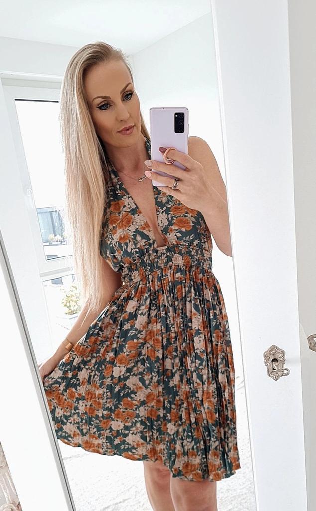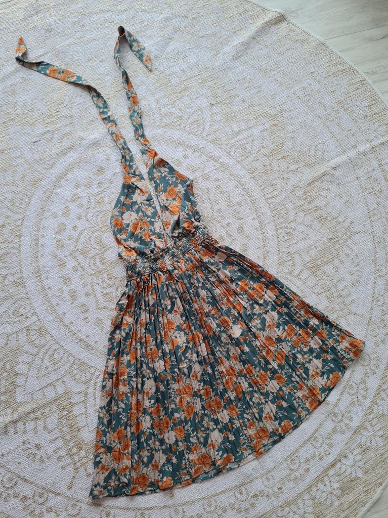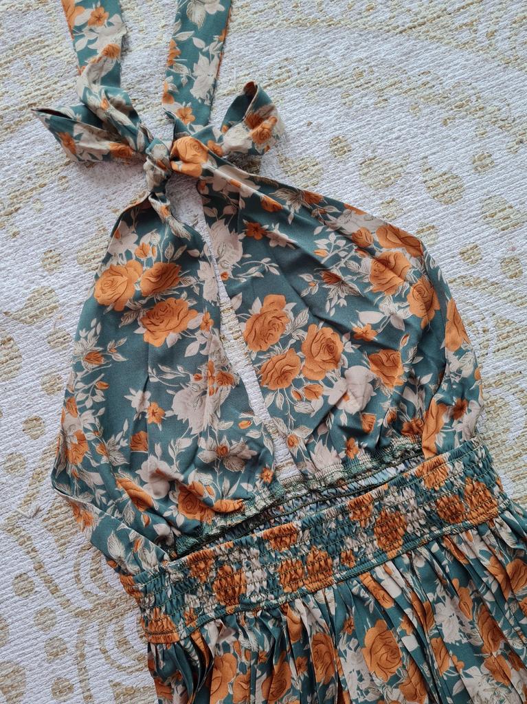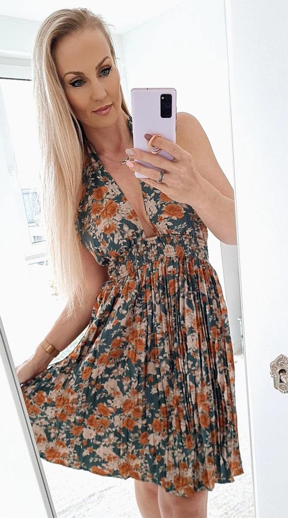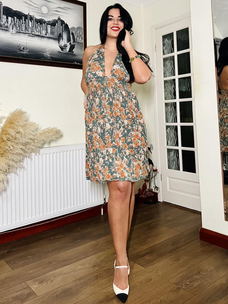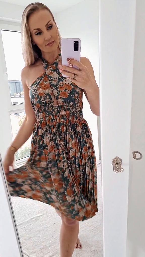 ♡ summery pleated dress with a back cutout ♡ 💥𝗟𝗶𝗲𝗳𝗲𝗿𝘇𝗲𝗶𝘁 3 weeks 💥𝗟𝗶𝗲𝗳𝗲𝗿𝘂𝗺𝗳𝗮𝗻𝗴 Delivery includes 1 dress in this color. This is a colorful flower pattern on a green background. It is available in sizes S to XL. I ordered it in size S . I wear size 36 to 38. I weigh 63 kg over 172 cm. Bra: 75D The dress fits me perfectly because it is very stretchy👍 💥𝗤𝘂𝗮𝗹𝗶𝘁ä𝘁 The dress is opaque, both in the upper part and in the lower part.... I think that's a good thing and important. I'm not wearing a bra in the photos and videos...and as you can see, you can't see anything through it. 👌 In addition, the cuffs below the chest are very stretchy. The dress is about kneeling (I'm 172 cm tall) and is nice and airy and swings nicely. As you can see from the photos, you can tie the ribbons on the upper part individually: either as a halter with space between the breasts or crossed in front of the neck so that the ribbons can then be tied in the neck... just as you like😃 The back is free. For material composition : 100% polyester 💥𝗙𝗮𝘇𝗶𝘁 Very beautiful and opaque pleated dress with a back cutout and individual binding on the upper part.