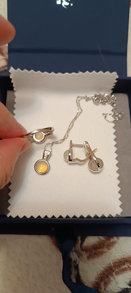 Very nice set. Only the chains in these sets are thin and the clasps are tiny, so you won't be able to put them on and take them off quickly because of their small size. I'll add: the stone is delicate, that's why there are scratches and it becomes completely transparent when you don't remove it. And when it lies in the box, it shines with colors again. The metal is unchanged, it does not darken, the spraying does not rub off 👍 I recommend the store and Jum.