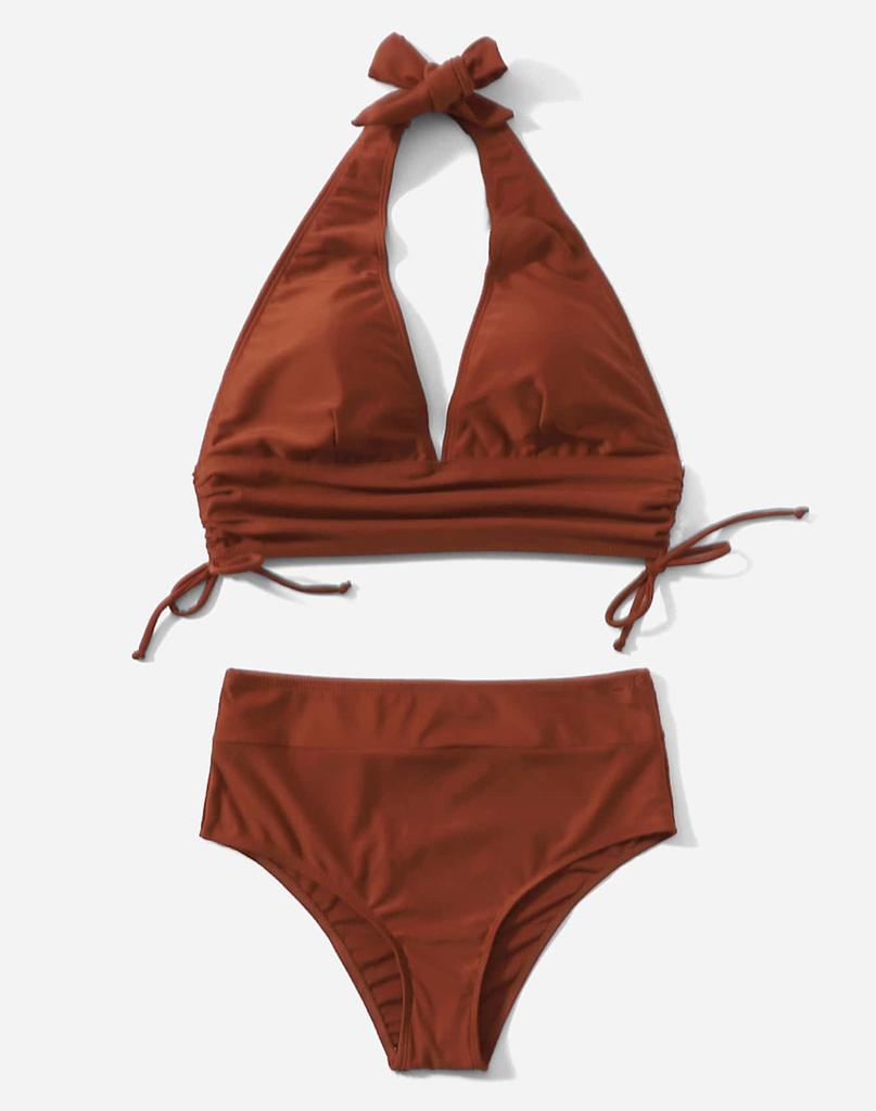 Sexy Women's Swimsuit Solid Color Halter Neck Drawstring High Waist Bikini Set Beachwear Bathing Suits — buy online with free worldwide shipping!